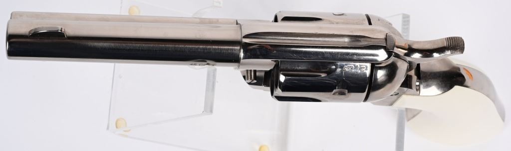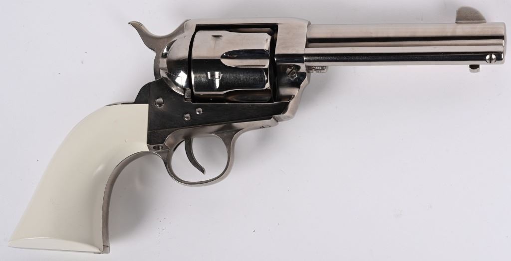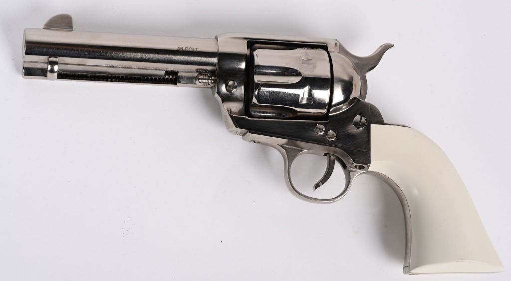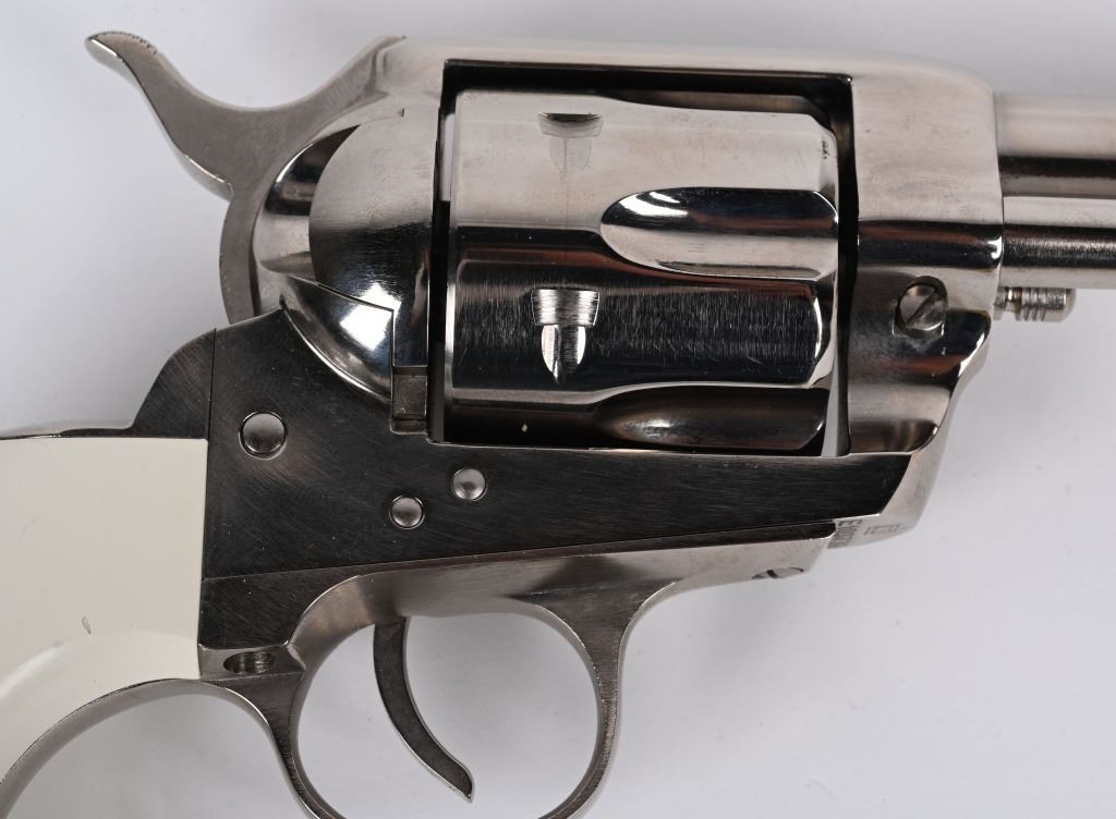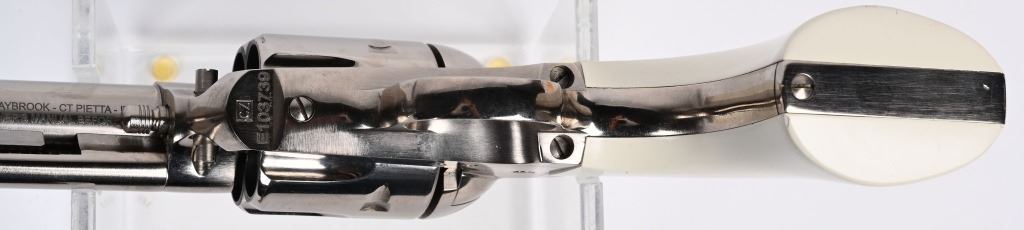 SERIAL NUMBER: E103739. BARREL: 4-3/4". CALIBER: .45 COLT. MANUFACTURED: 2020. Made in Italy. Blade front sight and u-notch rear. Factory brushed stainless finish and white plastic grips. CONDITION: Excellent overall, with a few handling marks and scratches. Bore is shiny with crisp rifling. Fine mechanics. MODERN