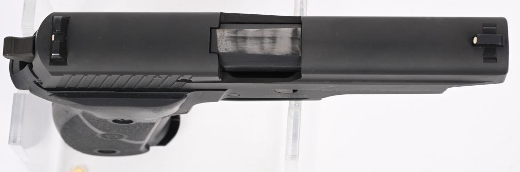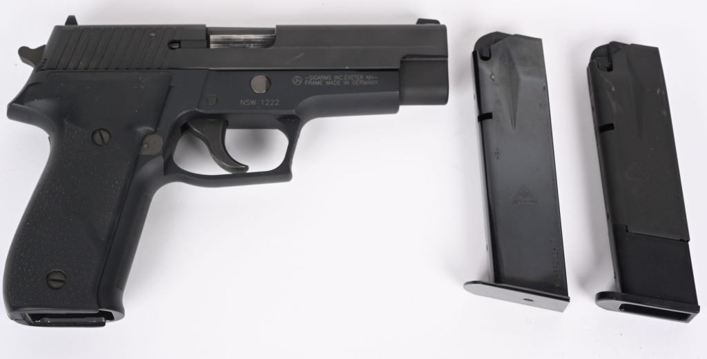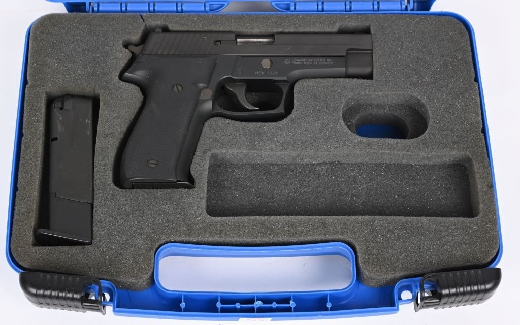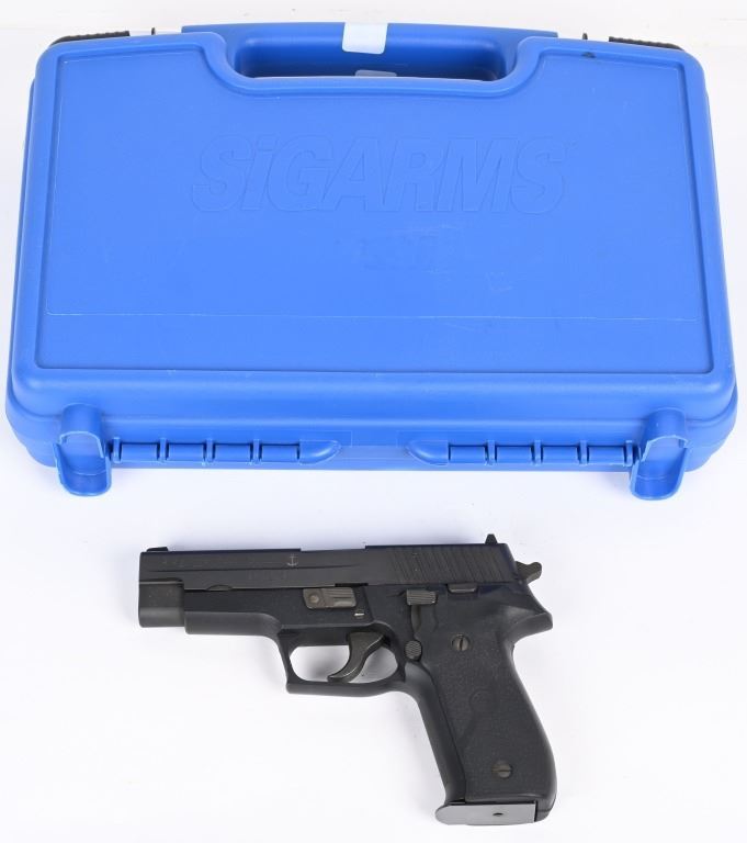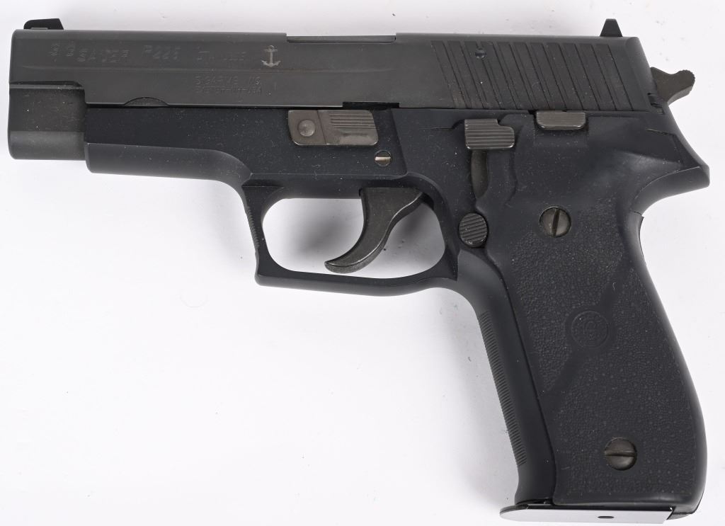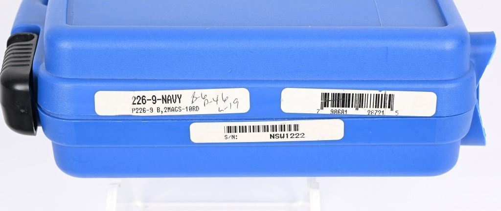 SERIAL NUMBER NSW1222 BARREL 4 3/8" CALIBER 9 X 19 9MM PARA MANUFACTURED 2004. Limited production of 2000 pistols with special serial number range. 1- 10 round Sig magazine and 1-17 round MecGar magazine. Stainless steel slide with Naval Anchor insignia on left side. Single / double action operation with decocking safety. Comes in numbered matching box with label marked "226-9-NAVY" CONDITION, Very good with excellent bright bore. Pistol retains 98% finish with traces of use wear on chamber and very minor edge wear. Fitted with soft rubber Hogue grips. Action operates properly. MODERN