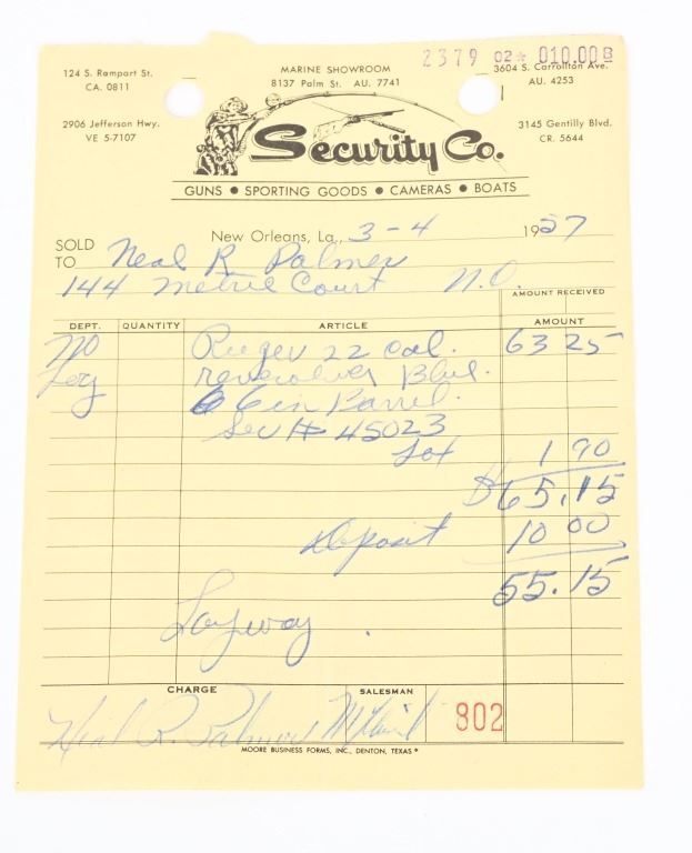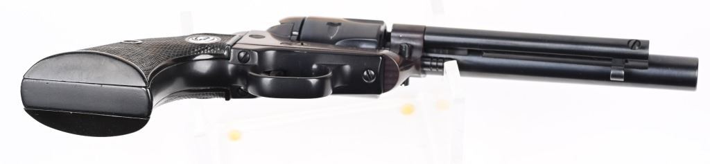 SERIAL NUMBER: 64878. BARREL: 5-1/2". CALIBER: .22LR. MANUFACTURED: 1957. 3-Screw model that was returned to the factory and converted to new model by adding a transfer bar. Standard sights. Original blued finish and checkered plastic grips. Includes the original hammer and parts, manual, after market wood grips and a factory return yellow box. CONDITION: Metal is excellent overall, with light handling marks. Frame is turning to a natural plum color. Grips are excellent. Bore is shiny with crisp rifling. Sharp mechanics. Extra grips and box is excellent. C&R