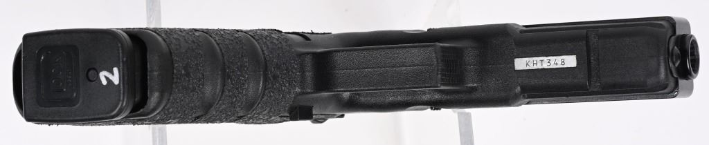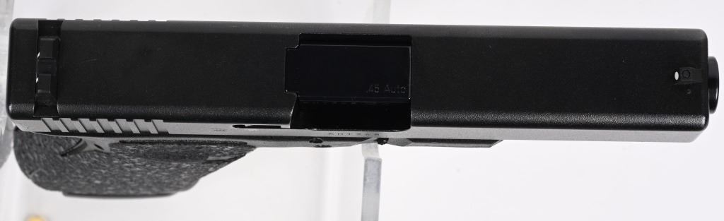 SERIAL NUMBER: KHT348. BARREL: 4-3/4". CALIBER: .45 ACP. MANUFACTURED: 2007. Gen 3 gun made in Austria. Factory blade front sight and u-notch rear. Black nitride finished slide and polymer frame. Grip area has added rubberized grip tape. Flashlight rail on the bottom of the frame. Includes factory 13 round magazine, manual and hard plastic case. CONDITION: Metal and frame are excellent overall, with light handling marks. Bore is shiny with crisp rifling. Sharp mechanics. Magazine and case have light wear. MODERN