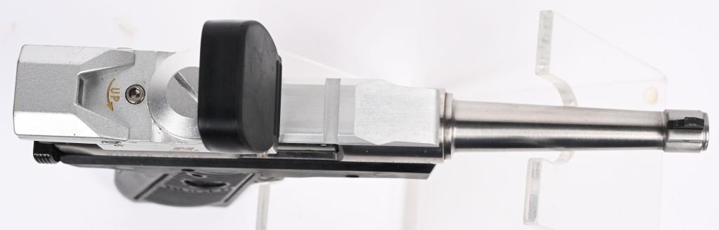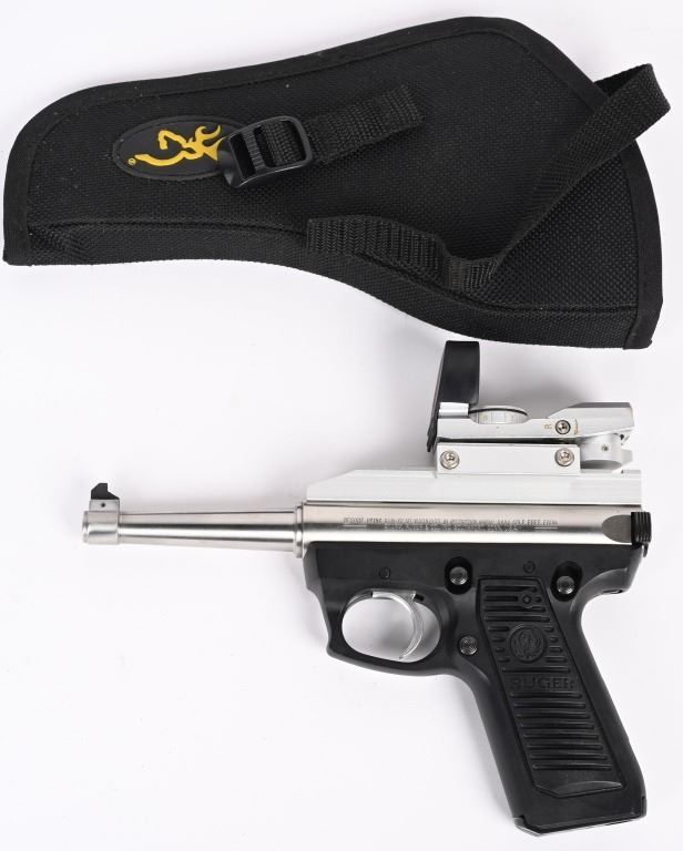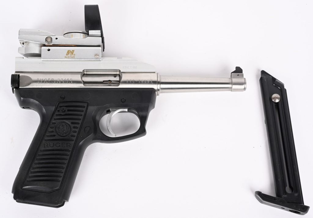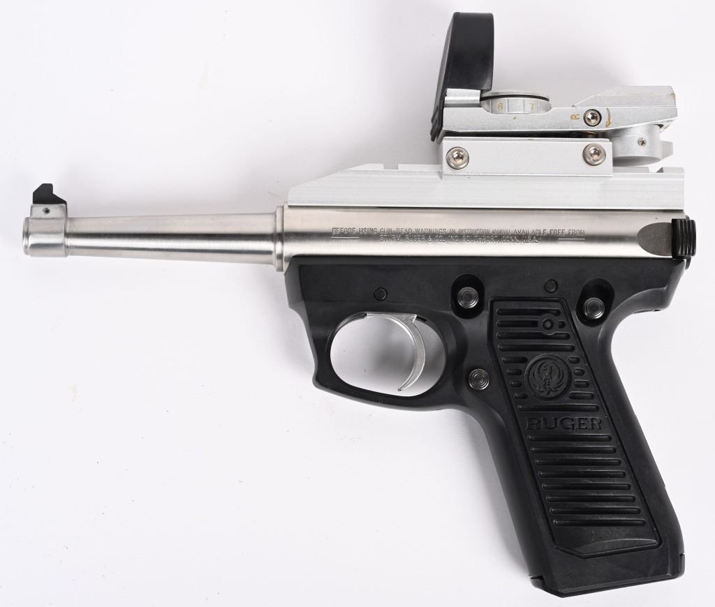 SERIAL NUMBER: 220-18087. BARREL: 4-3/4". CALIBER: .22LR. MANUFACTURED: 1992. Standard weight barrel, with blade front sight. Rear sight was removed for a rail, where there is a NcStar holographic red dot sight. Polished stainless steel finished frame. Black alloy frame. Includes a blued steel factory 10 round magazine. CONDITION: Metal and frame are excellent overall, with a few handling marks. Bore is shiny with crisp rifling. Mechanically fine. Sight will need a battery. MODERN
