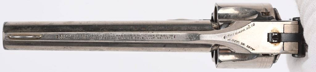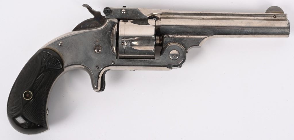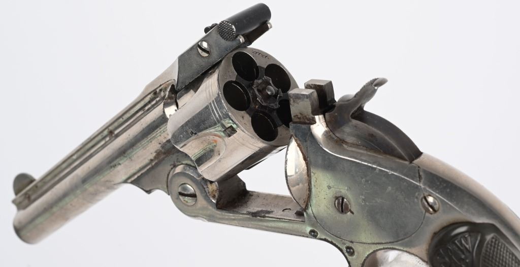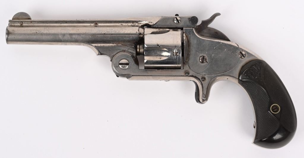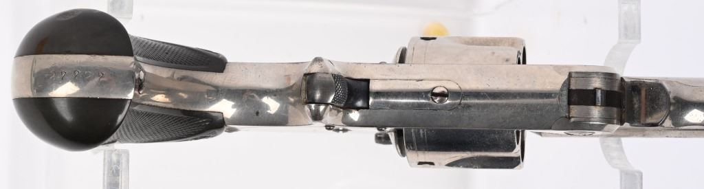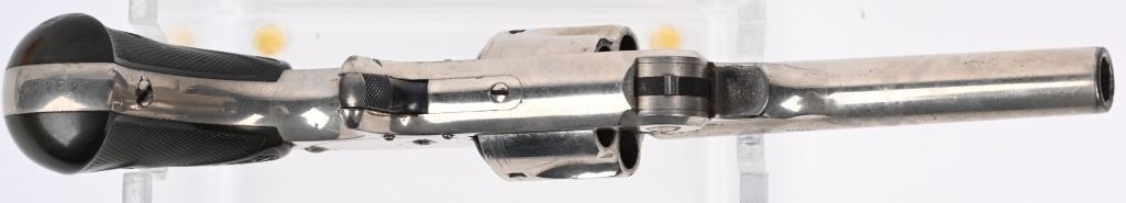 SERIAL 27727. BARREL 3.5". CALIBER 32 S&W. MADE 1878-1892. Break top, 5-shot spur trigger single action. Patent dates on barrel through 1877. checkered gutta percha grips, nickel finish with case color hammer. Condition. Fine, 95% nickel with usual handling & small surface marks. Near mint bore and fine action. ANTIQUE