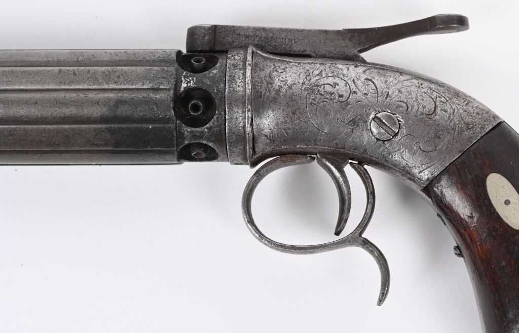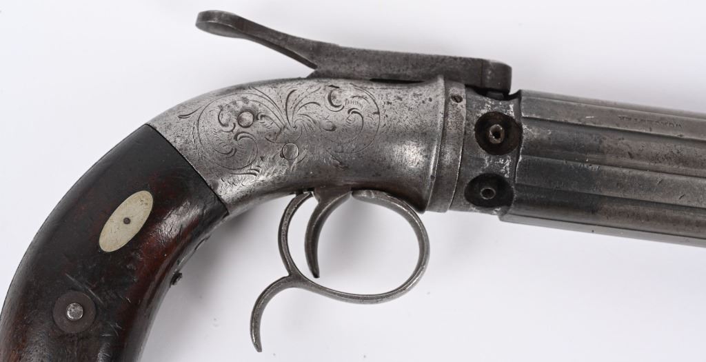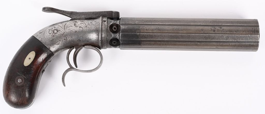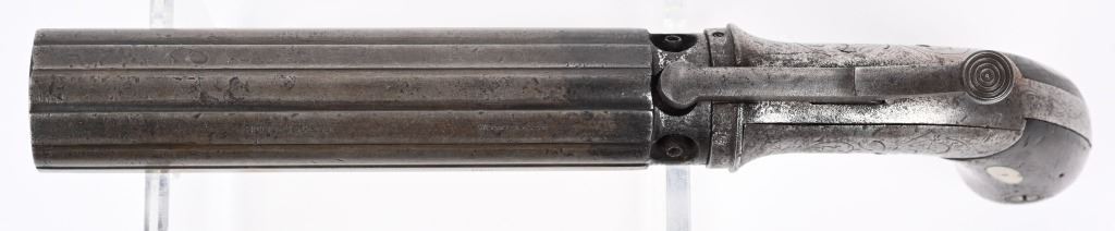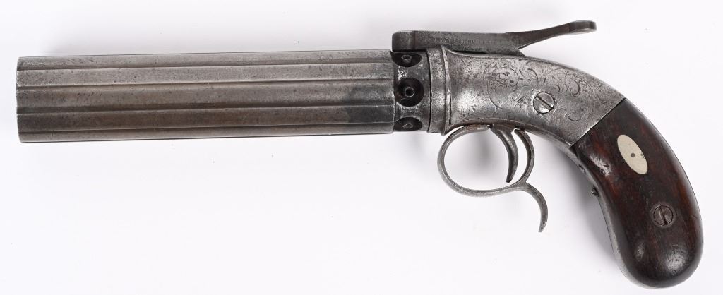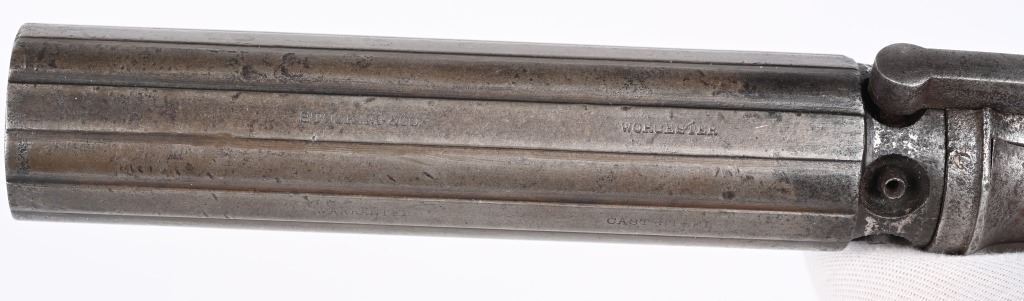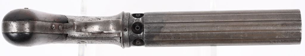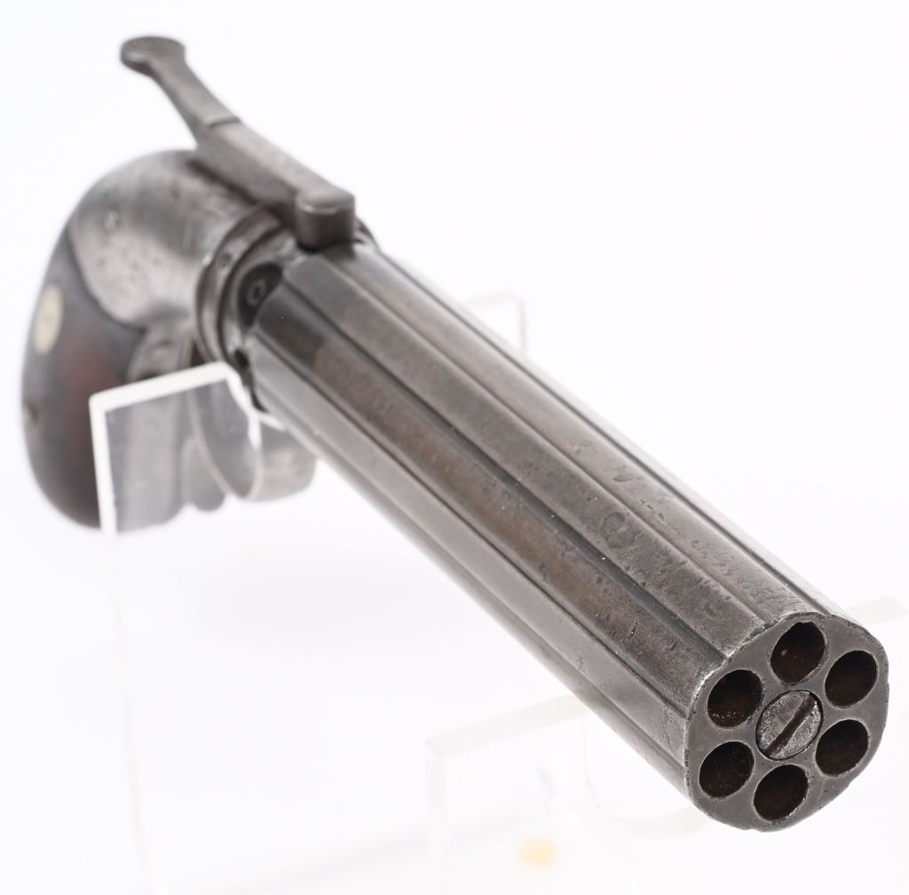 Alexander Stocking worked for the Allen & Wheelock company during its early days. Stocking secured a patent for his own pepperbox design in 1848 and by the following year had established his own gun making firm in Worcester, Stocking & Company. This is an unusual design in that it is a single action only with large top lever that advances the barrels so it must be pressed each time. This is referred to as a Dragoon Pepperbox due to its long 5" barrel as most were made to rest in ones pocket, these long barrel models were much harder to conceal and carry. It is a 6-shot, 28 caliber, raised ribbed barrel, walnut bag handles, engraved frame. Lever has patent date while barrel is stamped with maker. Condition. Smooth patina overall. Legends are all readable. Hammer cocks and stays in firing position but needs a new hand . ANTIQUE