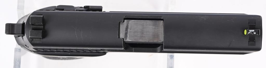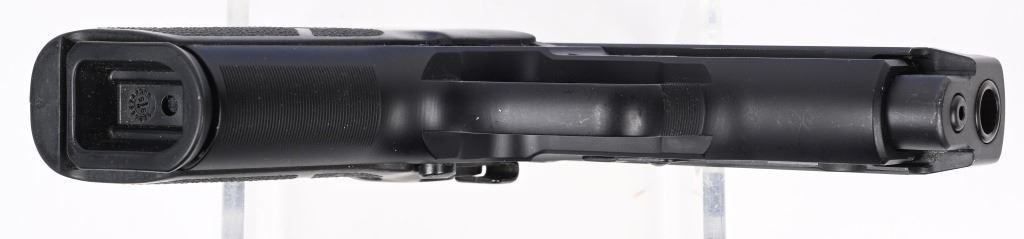 SERIAL NUMBER: AD33017. BARREL: 4". CALIBER: .40 S&W. MANUFACTURED: 2000'S. DA/SA gun, with the frame being made in Germany. Upgraded Trijicon 3-dot sights. Phosphate finished stainless steel slide and alloy frame. After Market Hogue rubber grips. Includes two factory 10 round mags, one factory 12 round mag, lock, manual and a non matching blue plastic hard case. CONDITION: Metal is excellent overall, with a few light handling marks. Grips have light scratches. Shiny bore with crisp rifling. Magazines are very good with light wear. Case is excellent. MODERN