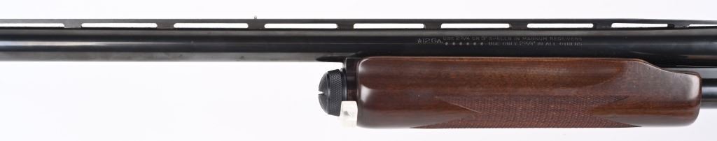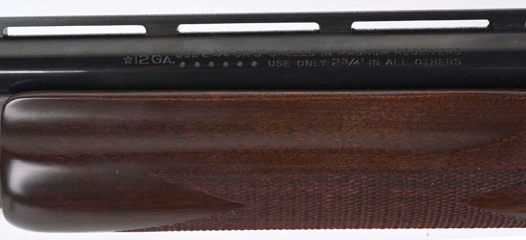 SERIAL NUMBER: W557989M. BARREL: 28". CALIBER: 12 GAUGE. MANUFACTURED: 1987. Magnum receiver, stamped "WINGMASTER" on the side. Vent rib barrel, with bead front sight. Original blued finish and oiled wood stock/forearm. Checkered wrist and forearm. Brown rubber butt pad. 3" chamber. Cylinder choke bore (removable choke tubes, only one included is installed). LOP is: 14". CONDITION: Metal is excellent overall, with a few handling marks. Wood is excellent as well. Bore is shiny. Fine mechanics. MODERN