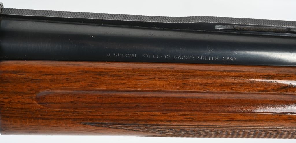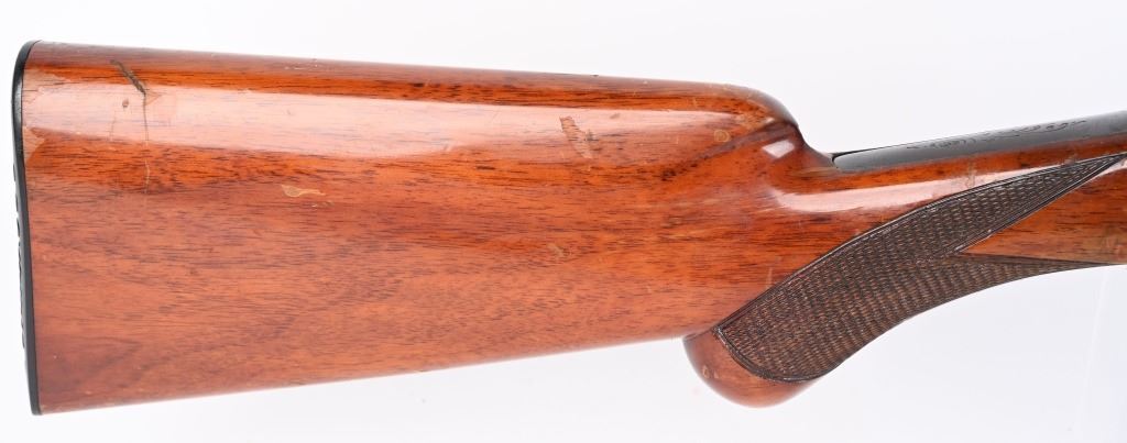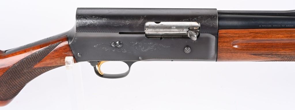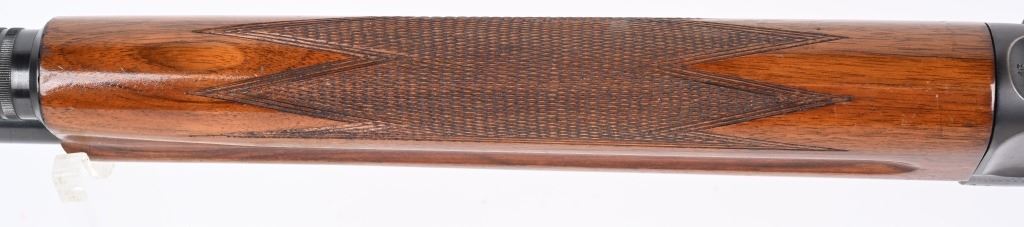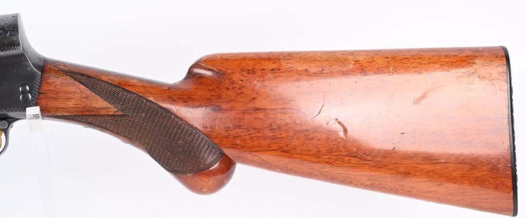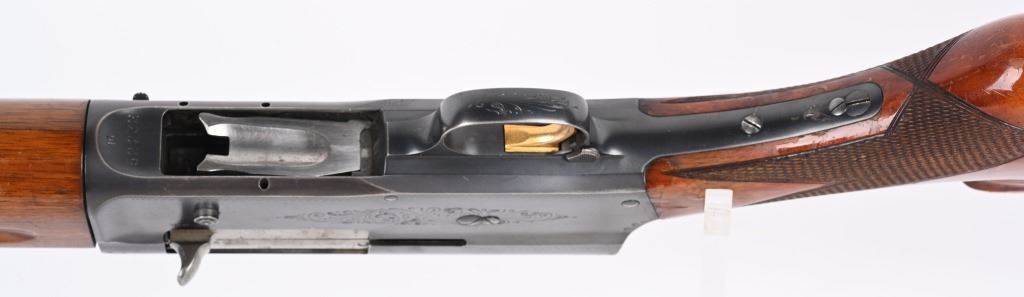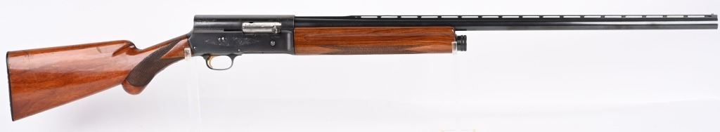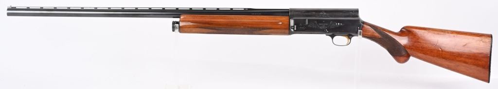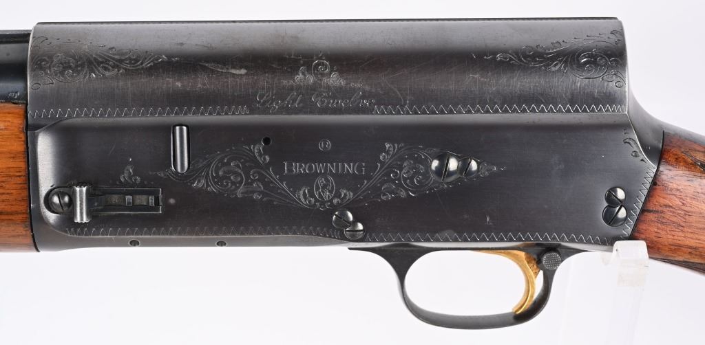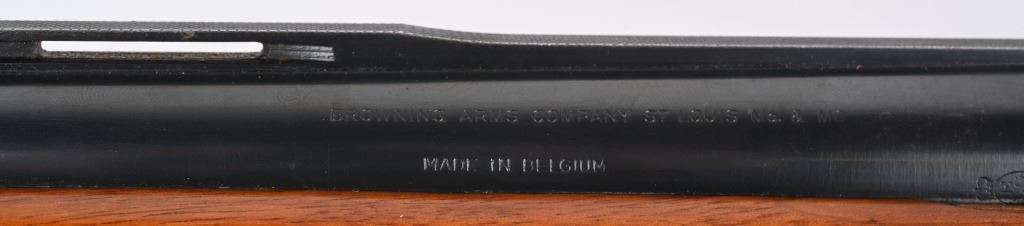SERIAL NUMBER: 1G52232. BARREL: 29-1/2". CALIBER: 12 GAUGE. MANUFACTURED: 1961. Belgian made, by FN, for Browning. Vent rib barrel with bead front sight. Original blued finish, with floral scroll engraving on the frame. Gold washed trigger. Oiled wood forearm and sock, with fine checkering on both. Factory black plastic butt plate. 2-3/4" barrel. Full choke bore. LOP is: 14-1/2". CONDITION: Metal is excellent overall, with a few handling marks and scratches. Some light wear on the frame. Wood has handling marks, scrapes and scratches. Most wear is on the wrist section. Bore is shiny. Mechanically fine. C&R