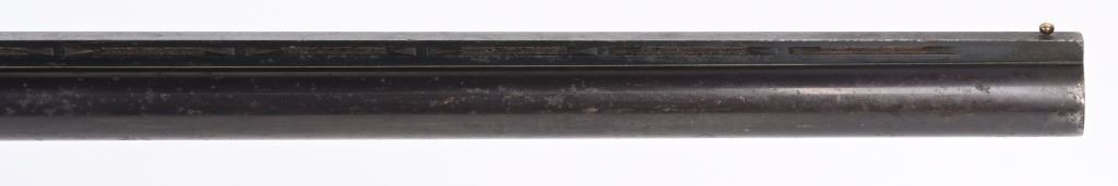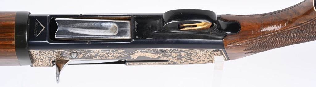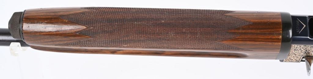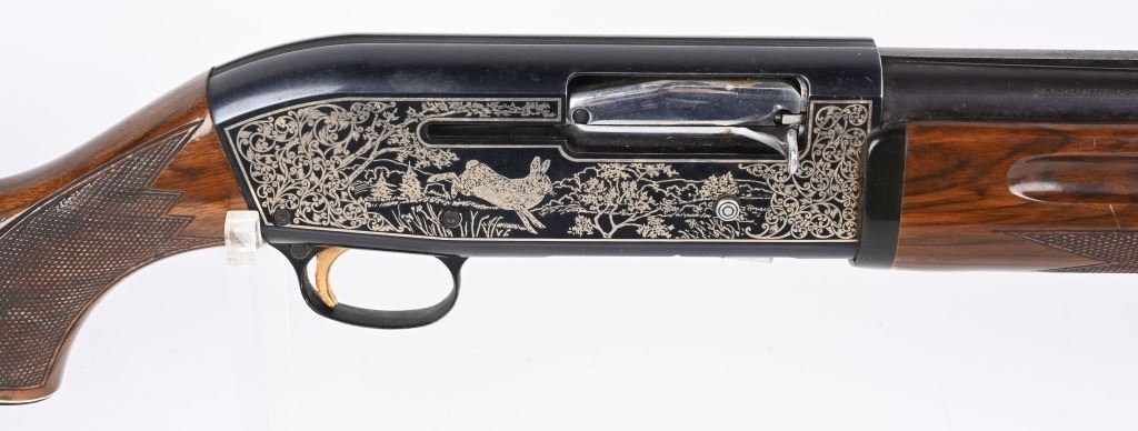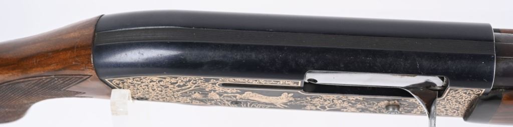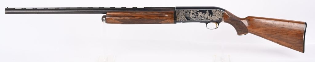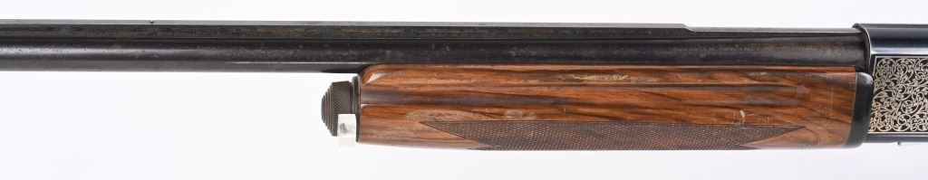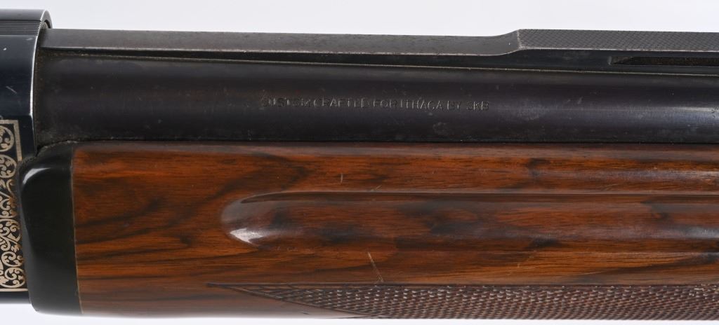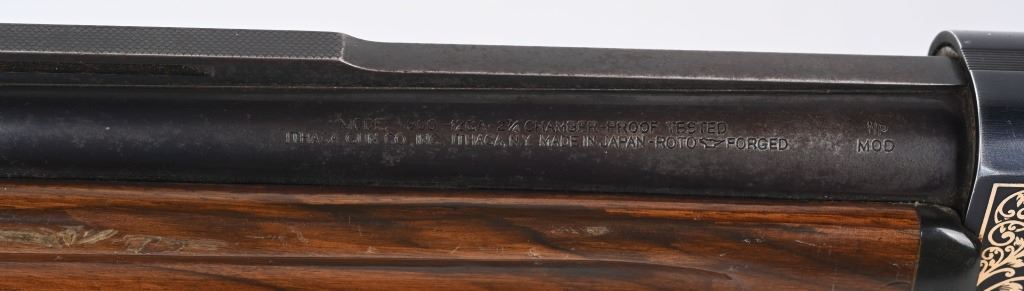 SERIAL NUMBER: S37668. BARREL: 28". CALIBER: 12 GAUGE. MANUFACTURED: 1980'S. Made in Japan by SKB, for Ithaca. Vent ribbed barrel, with brass bead front sight. Black alloy frame with laser etched game scenes on both sides of the frame. Barrel is blued. Gloss finished wood stock/forearm, with fine checkering on both. Checkered plastic butt plate. 2-3/4" chamber. Modified choke bore. LOP is: 14-1/4". CONDITION: Metal is fair-good, with splotches of surface rust on the barrel. Frame has light wear and scratches. Wood has heavy handling marks and scratches. Bore is clean overall. Mechanically good. MODERN