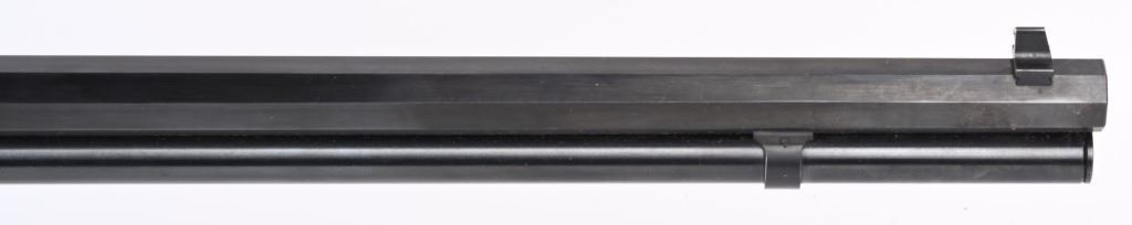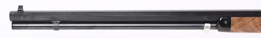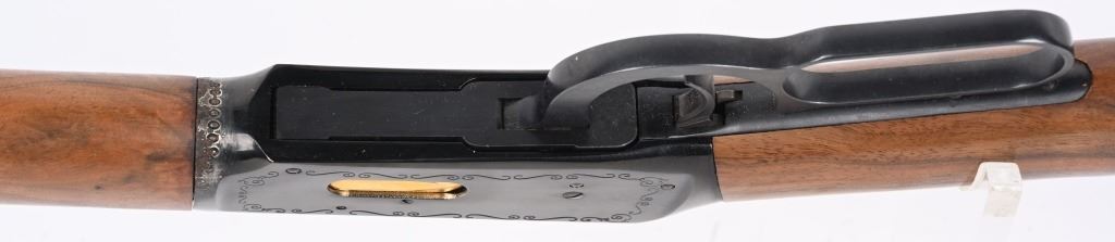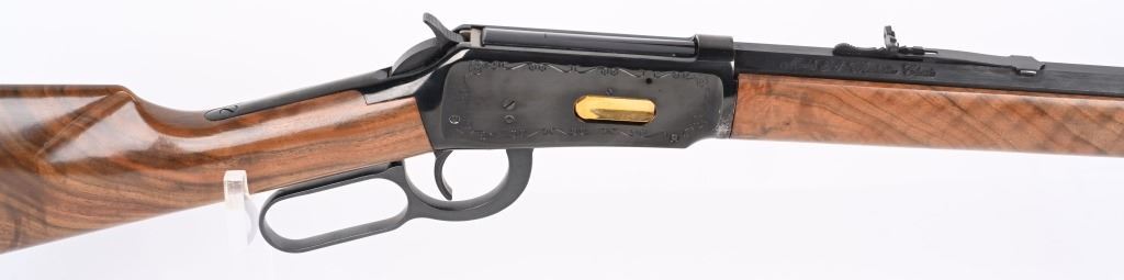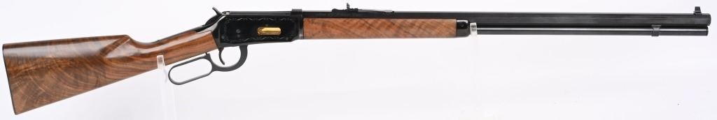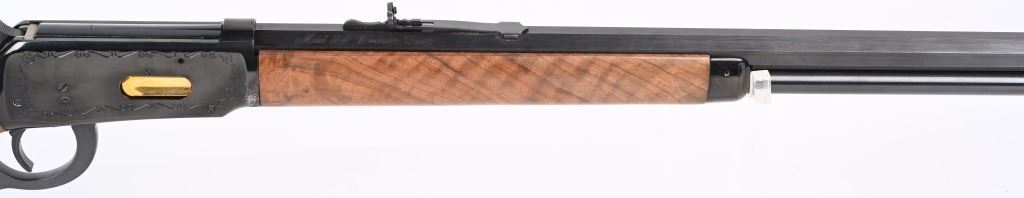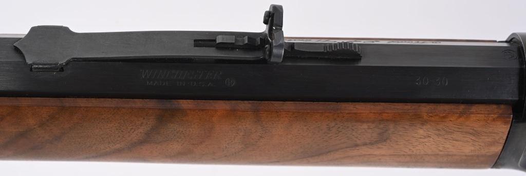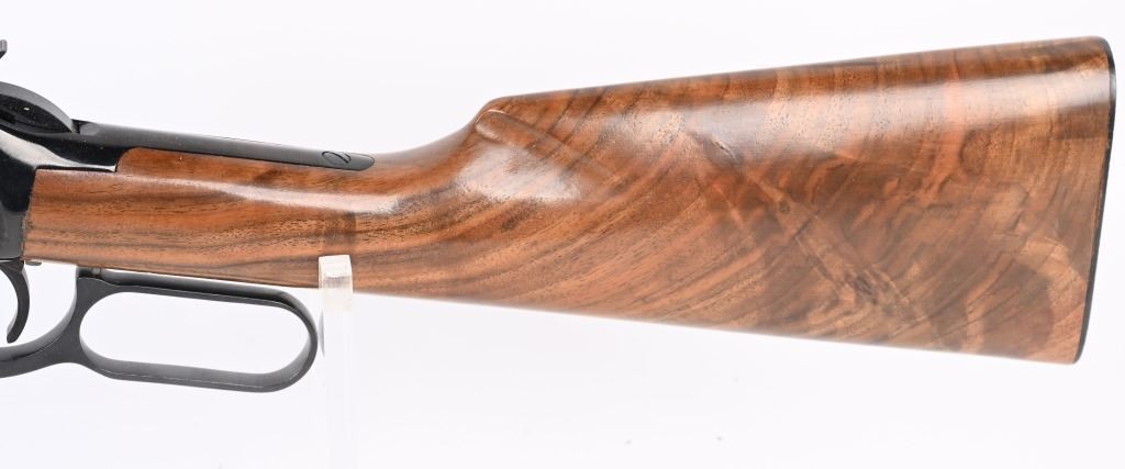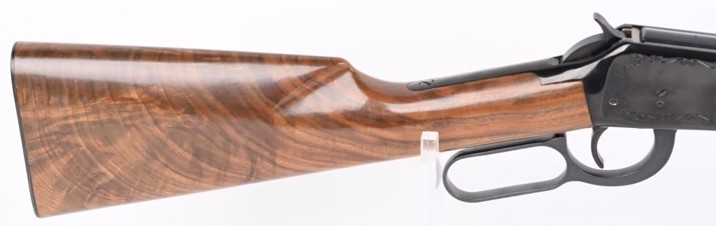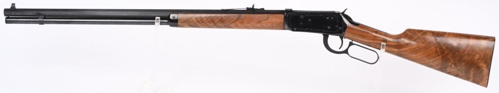 SERIAL NUMBER 3000096. BARREL 26". CALIBER 30-30. Features full octagon barrel, full magazine sporting sights, light border engraving on frame, deluxe grain walnut stocks, steel butt plate. Comes in original matching box. CONDITION. Near new, appears unfired with light handling. A bit of bad storage at serial number that was cleaned and touched up. MODERN