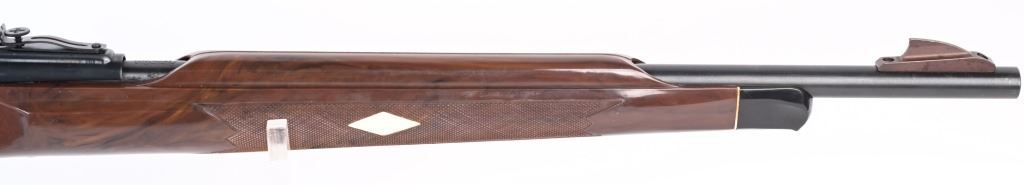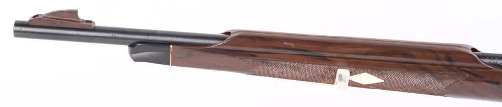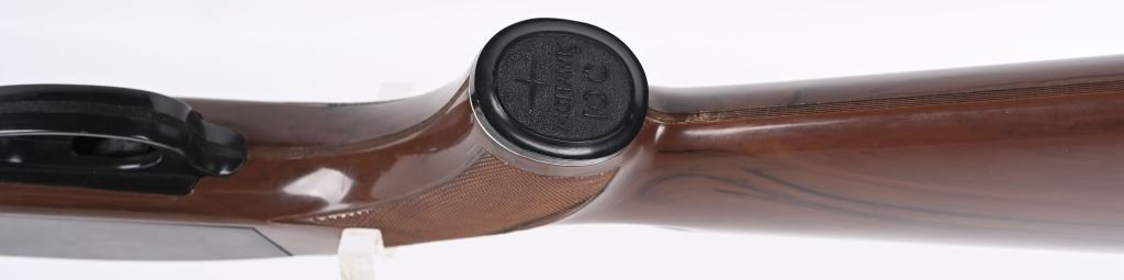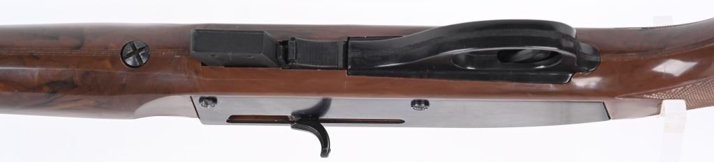 SERIAL NUMBER: 2497073. BARREL: 19-1/2". CALIBER: .22LR. MANUFACTURED: 1975. Standard markings and features. Factory blade front sight and adjustable u-notch rear. Factory blued metal parts and iconic brown plastic stock, with white plastic medallion inserts. Serrated plastic butt plate. Includes one five round plastic magazine. CONDITION: Metal is very good overall, with a few pin pricks of surface rust on the exterior of the barrel. Stock has a few handling marks and scrapes. Bore is shiny with crisp rifling. Good mechanics. Magazine is excellent. MODERN