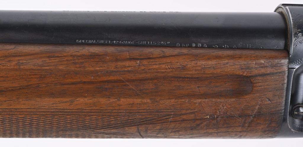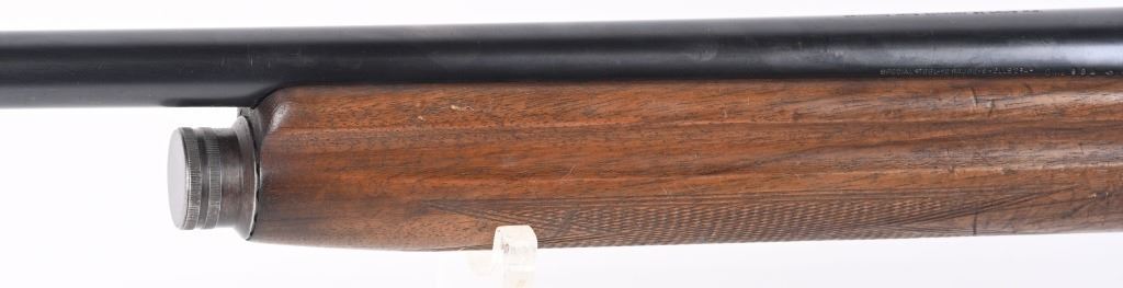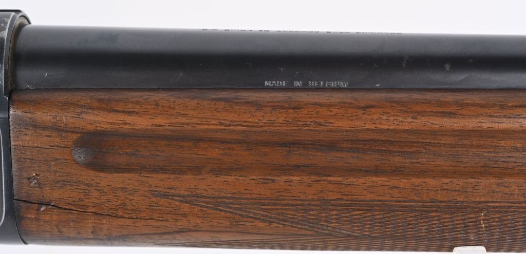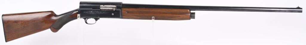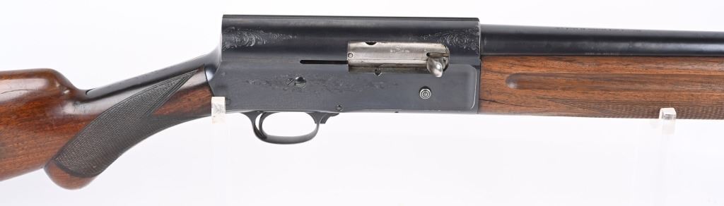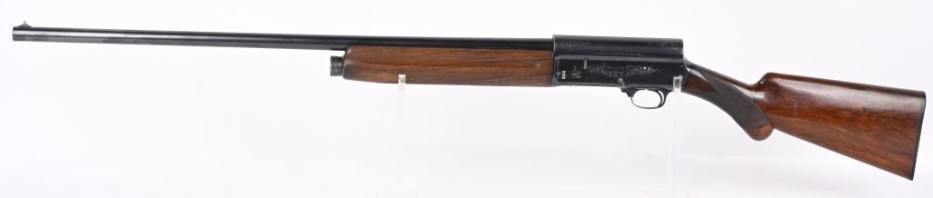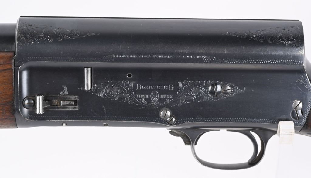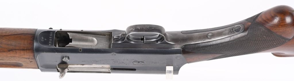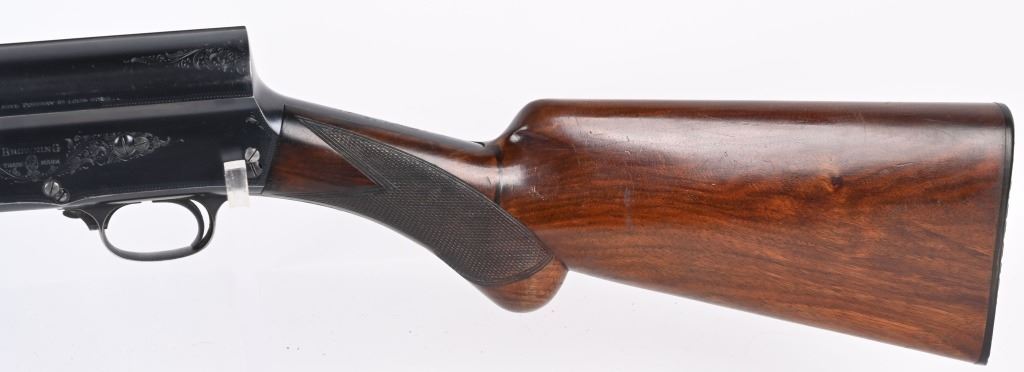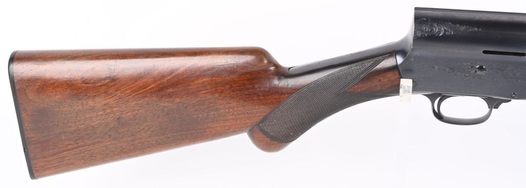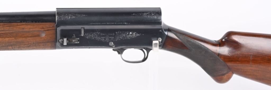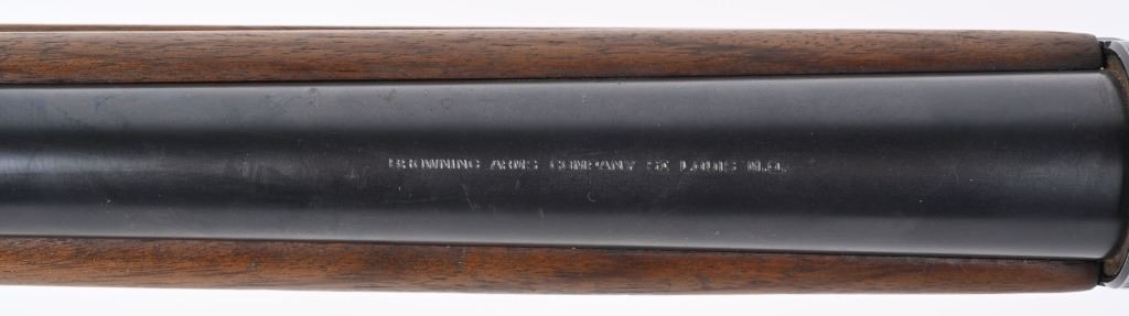 SERIAL 225041. BARREL 29.5". GAUGE 12. CHAMBER 2 3/4". CHOKE FULL. MADE IN 1938. Features bead on base front sight, blue finish, round knob checkered stock, Browning gutta percha butt plate. CONDITION. Solid 95% blue with most wear on lower tang with some light high edge wear and minor handling. Fore-arm shows the usual stress cracks found on these early guns along with some bruising. Round knob stock is excellent with some impressions. Bore is bright. C&R