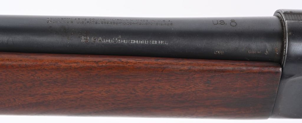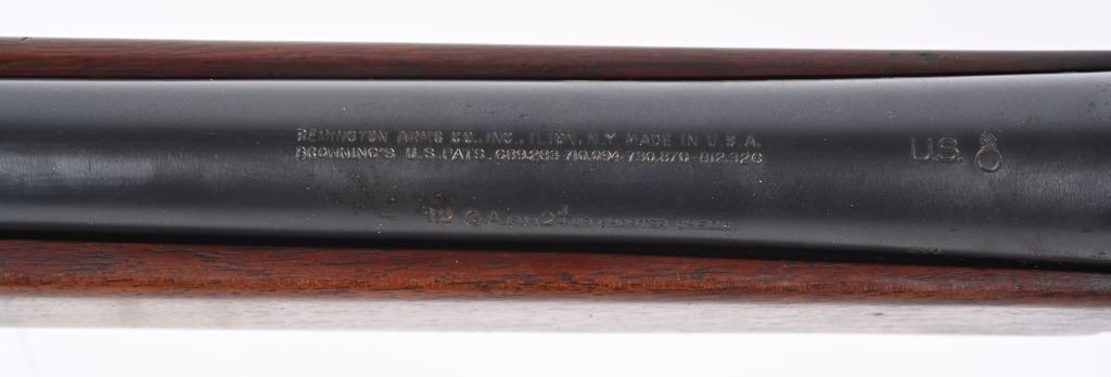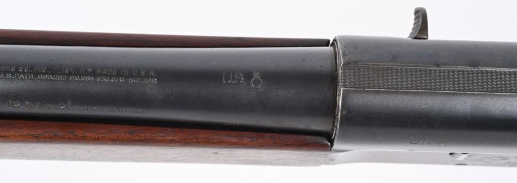 SERIAL 474936. BARREL 26". GAUGE 12. CHAMBER 2 3/4". CHOKE CYL. These were issued to the US government for training and guard purposes. Both the frame and barrel have the US and Ordnance bomb stamp. Standard features includes a blue finish, plain pistol grip walnut stock with added butt pad. Condition. Frame retains 90% of reapplied blue finish. Barrel retains 95% blue. Stocks are excellent with note to period added pad. Bore is bright. C&R