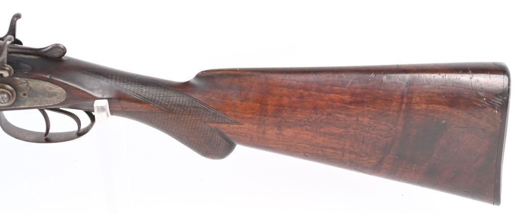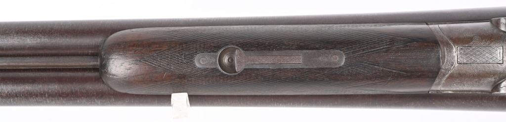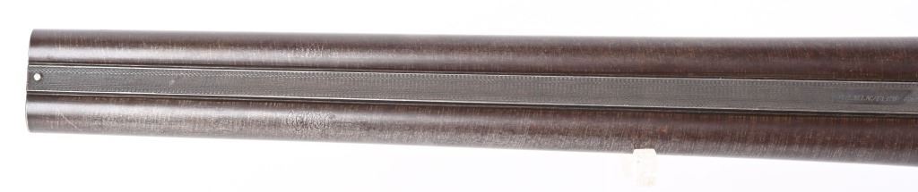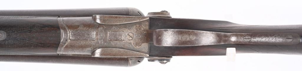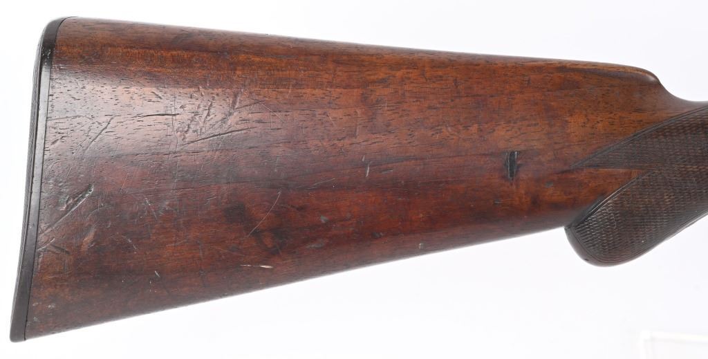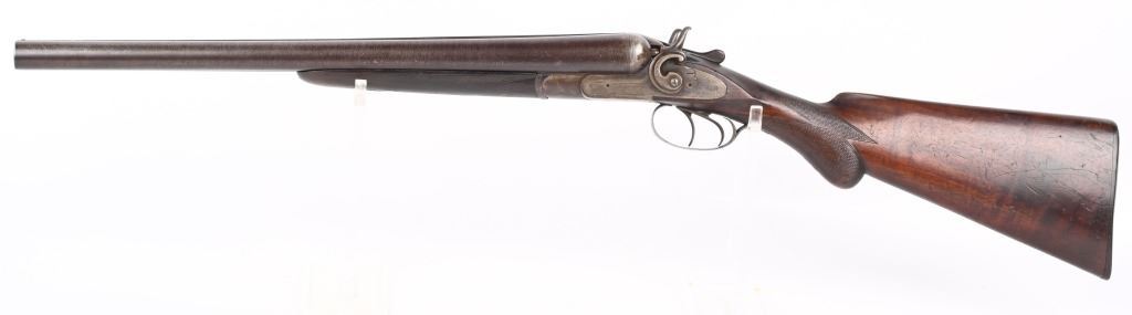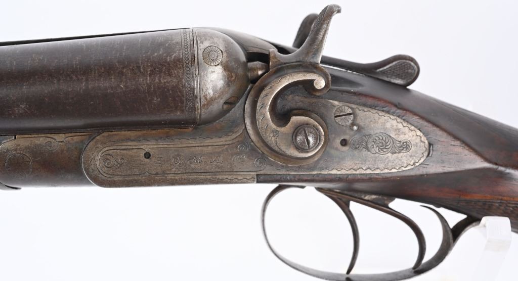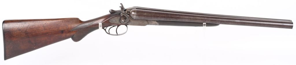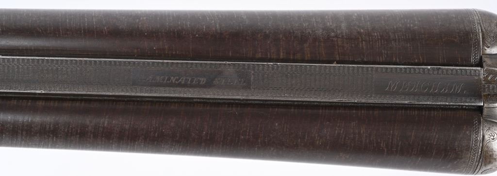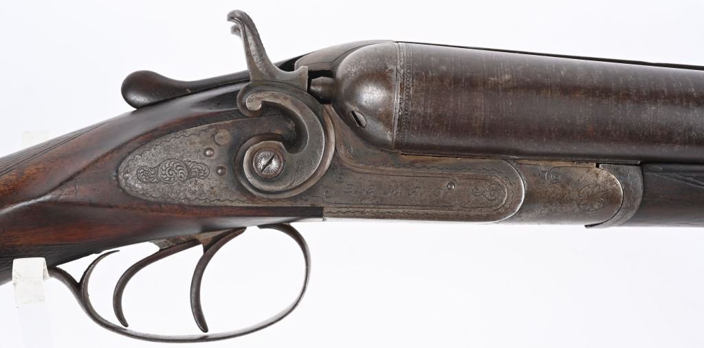 SERIAL 93296. BARRELS 19 1/4". GAUGE 10. Rib stamped MEACHAM LAMINATED STEEL". Side plates stamped E.C.M.A. CO. Fine browned twist pattern barrels., exposed hammers, double triggers, splinter fore-end, checkered round knob walnut stock. Condition. Fine brown finish on barrels with tight lock up and clean bores. Frame basically patina with flashes of color. Stocks are excellent with minor impressions. These short 10 bores are massive and quite impressive. ANTIQUE