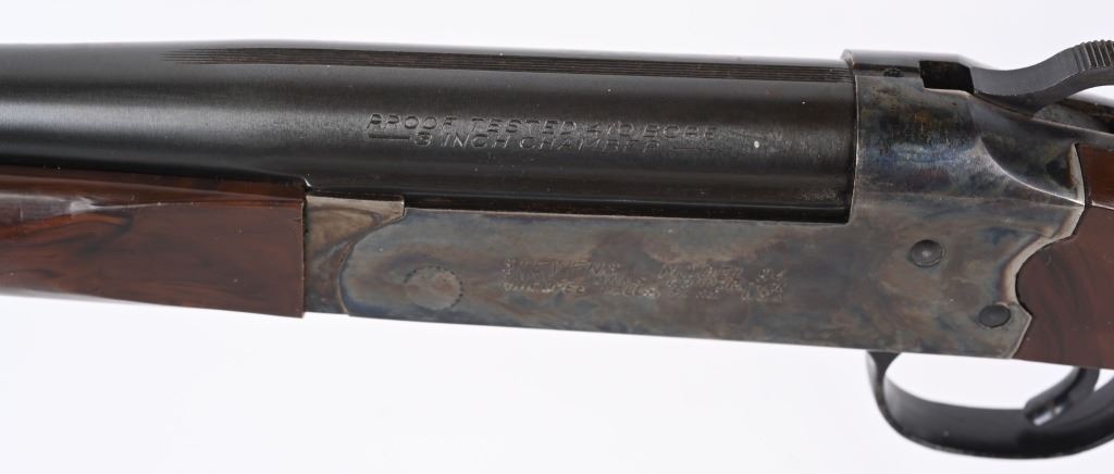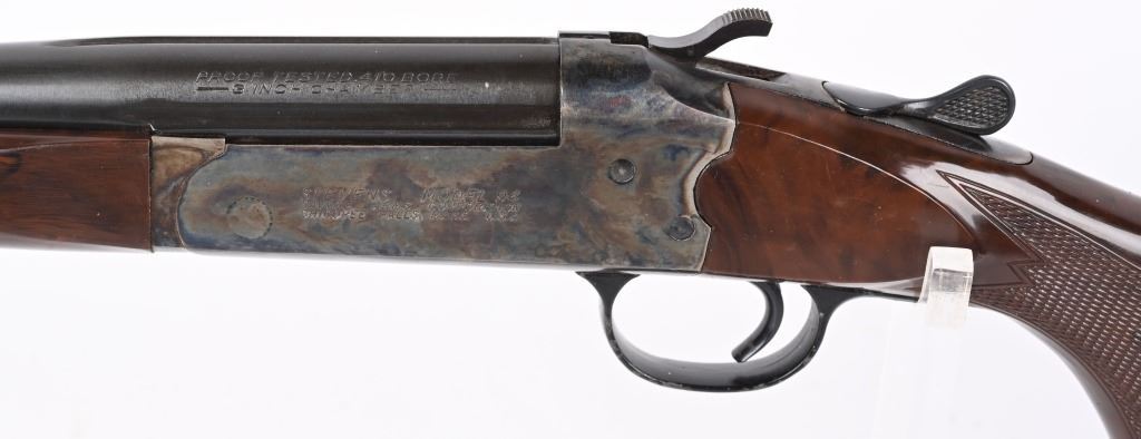 SERIAL NSN. BARREL 26". GAUGE 410. CHAMBER 3". CHOKE FULL. LOP 14". No. 94 made 1926-45 . Stevens first used the Tenite stocks during the war due to wood shortage so this gun dates to the end of production for the Pre Savage Tenite model 94. Features break open, blue barrel, exposed hammer, case color frame, pistol grip Tenite brown stock & fore-arm. Condition. Fine with 95% plus blue and case colors with some age freckling on barrel. Stock is excellent with usual handling marks but not cracked. Bore is mirror bight. C&R