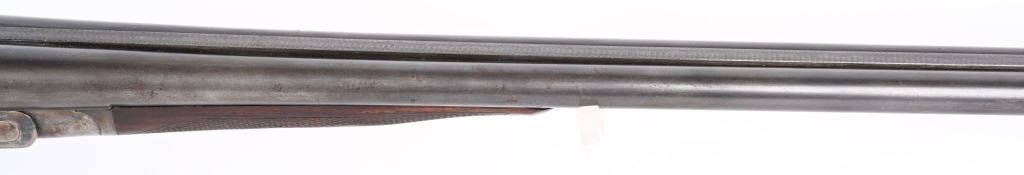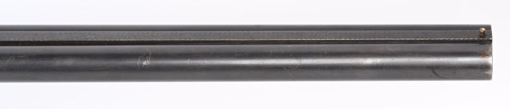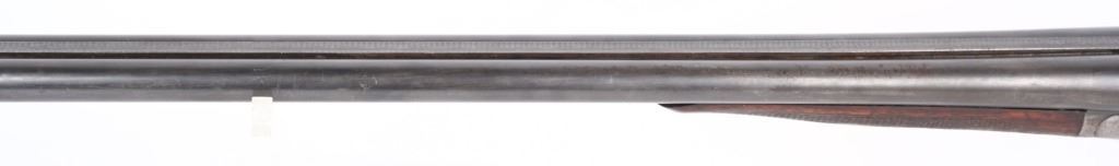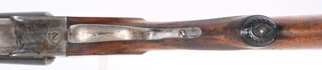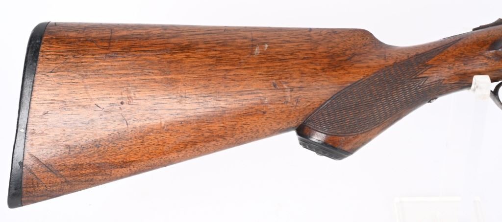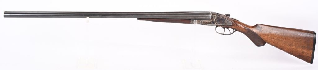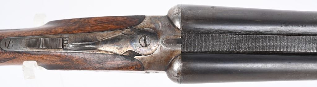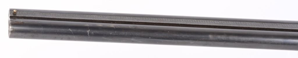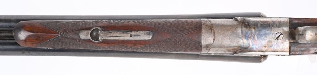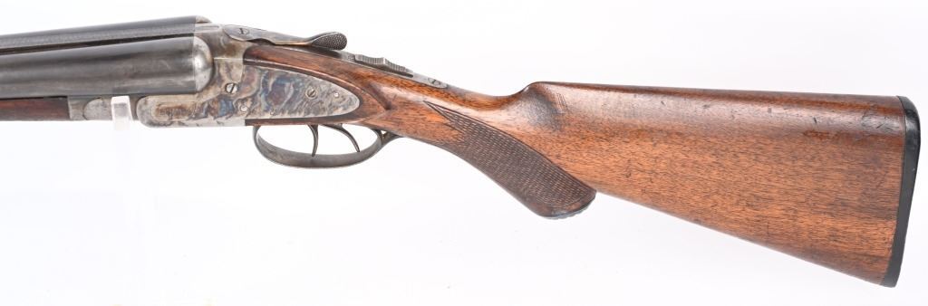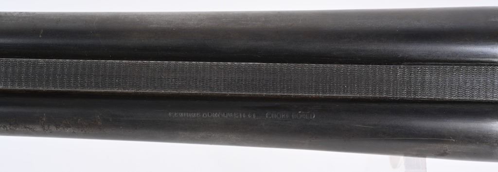 SERIAL NUMBER: 12530. BARREL: 30". CALIBER: 12 GAUGE. MANUFACTURED: 1900'S. Left barrel is marked "GENUINE ARMORY STEEL CHOKE BORED". Matching serials on the water table, barrel and forearm. Barrels are blued, with the frame being case colored. Double triggers and tang safety. Oiled wood stock, with checkering on the wrist and forearm. Capped pistol grip and checkered hard rubber but plate. 2-3/4" cahmber. Full/extra full chokes. LOP is: 14". CONDITION: Metal is good overall, forming an even gry patina on the barrels. Case coloring on the frame is about 75%, with more wear around the front of the frame. Wood has minor dents, scrapes and scratches. Bores are shiny. Tight lockup. C&R