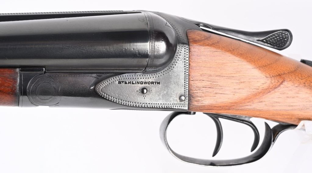 SERIAL NUMBER: 106734. BARREL: 28". CALIBER: 12 GAUGE. MANUFACTURED: 1910'S. Philadelphia made gun, "STERLINGWORTH FLUID COMPRESSED STEEL" marked on the top of the right chamber. Matching serial numbers on the components. Solid matte rib, with the bead front sight broken off. Re-finished metal components. Tang safety and double triggers. Plain grip sanded and oiled wood stock. Solid metal butt plate. 2-3/4" chambers. Full and extra full chokes. LOP is: 15-1/4". CONDITION: Metal is very good overall, as refinished, with light handling marks and wear. Bores are shiny. Lockup is tight. C&R