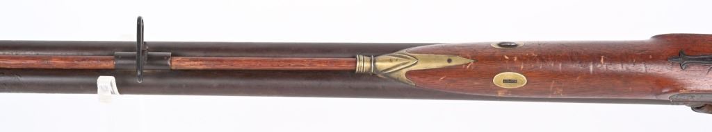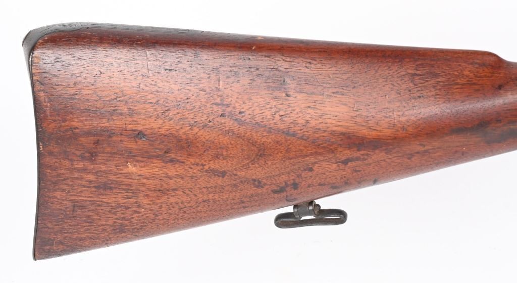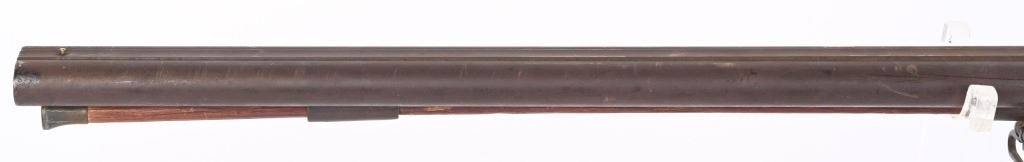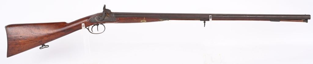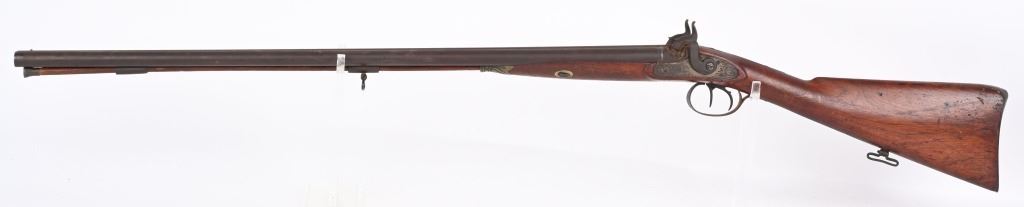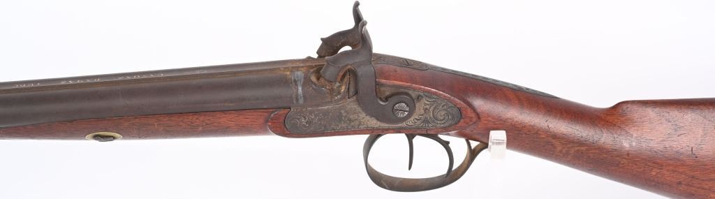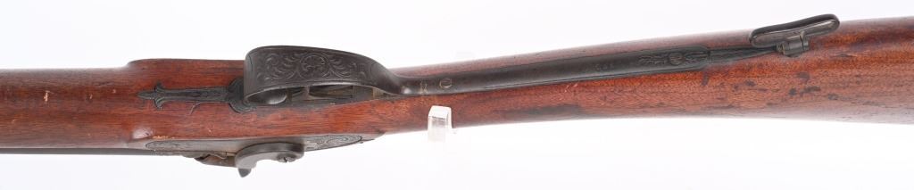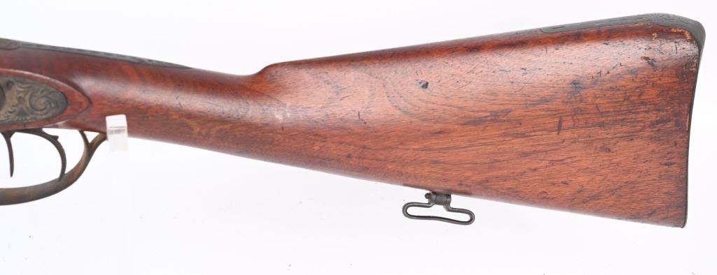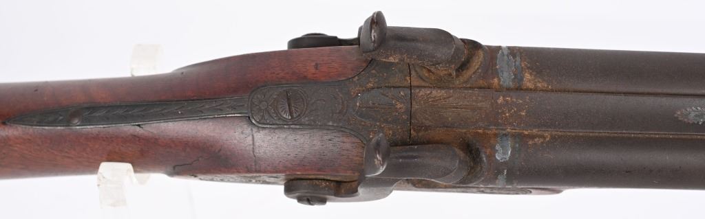 SERIAL NUMBER: 993. BARREL: 29-1/2". CALIBER: 20 GAUGE. MANUFACTURED: 1880'S. No markings on the frame, minus the scroll engraving. Barrel rib is marked "CANONS DAMAS TURC FINS". Silver bands around the chamber area. Solid rib, with bead front sight. Metal components have a brown patina finish. Oiled wood stock with smooth metal butt plate. Wooden ramrod. CONDITION: Metal is fair overall with a heavy brown patina throughout. Wood has handling marks, scrapes and scratches. Bores are fair with some frosting. Nipples have pancaking and surface rust around the area. Hammers are tight and working. ANTIQUE