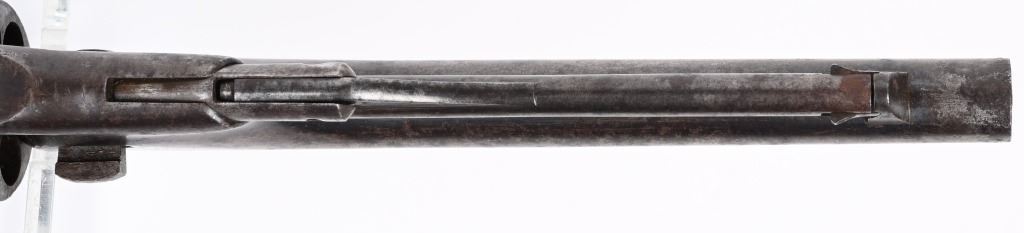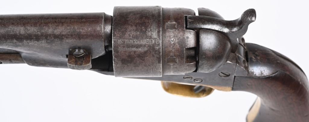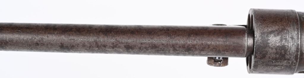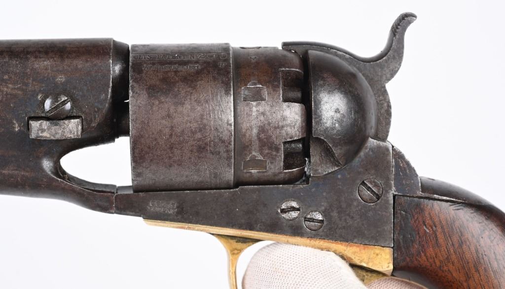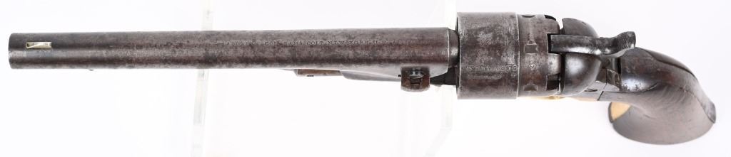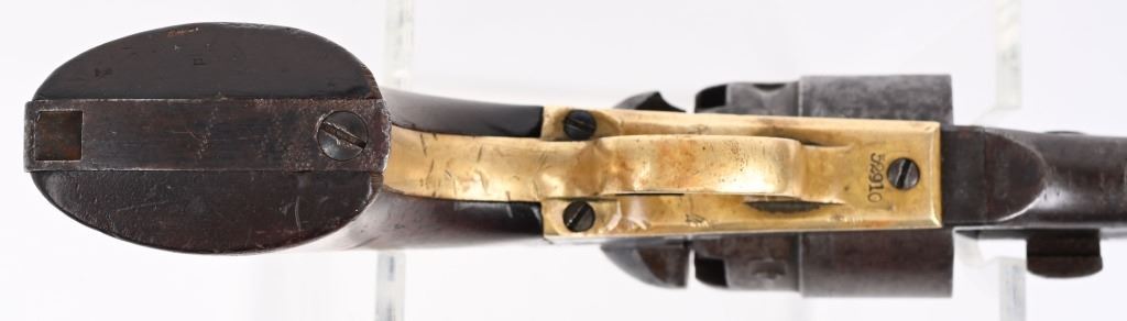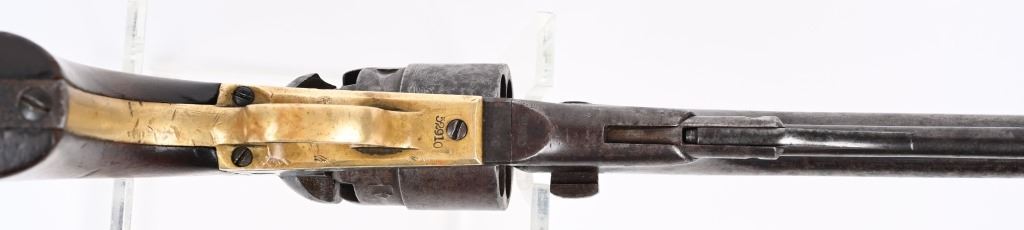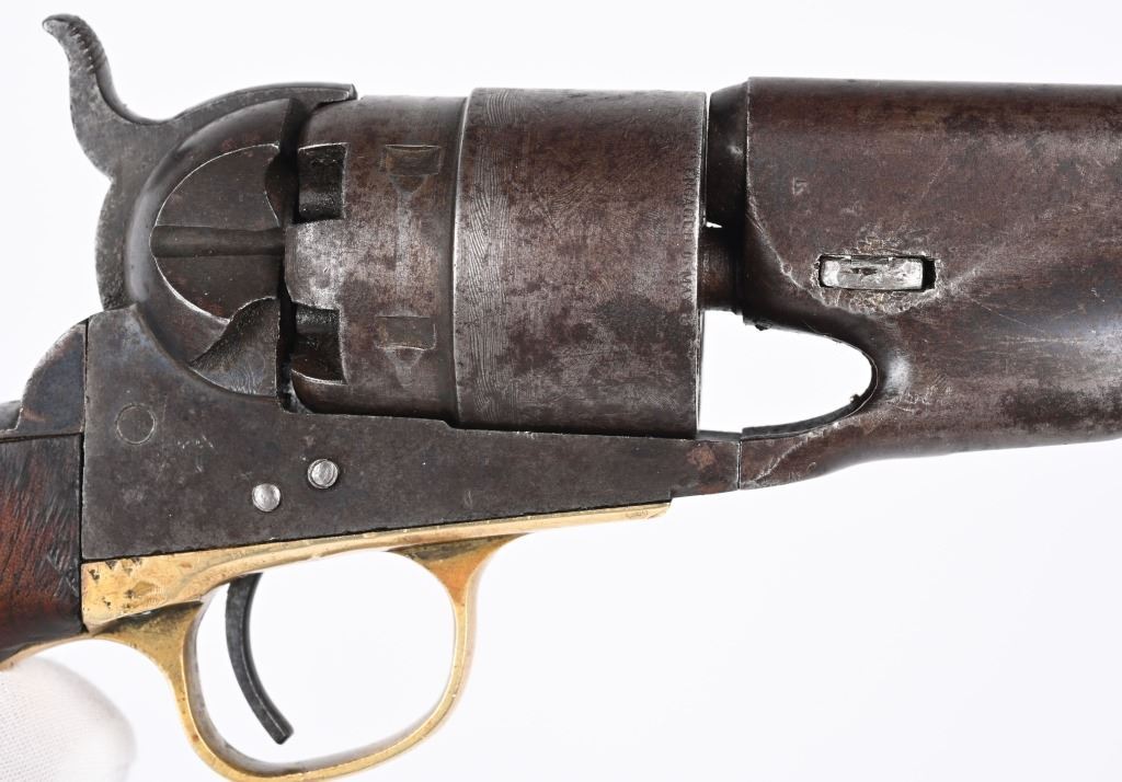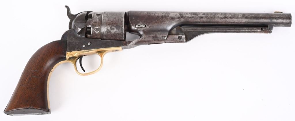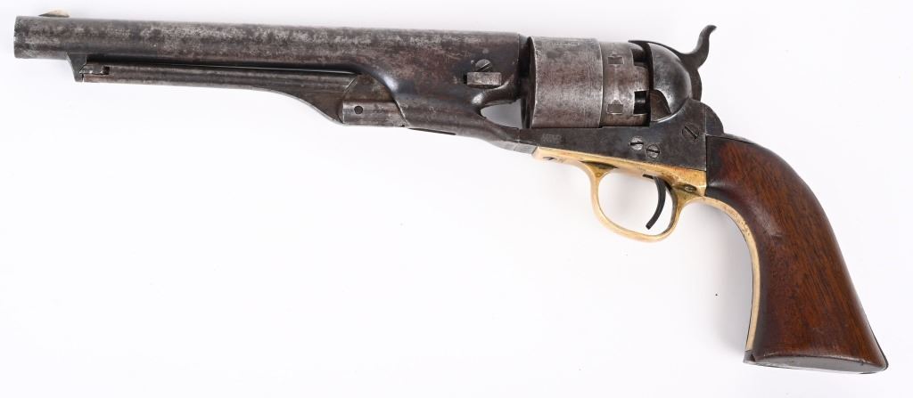 SERIAL 52910. BARREL 8". CALIBER 44. MADE IN 1862. Standard military issue very early war production with blue and case color finish, one piece walnut grips with visible but not readable cartouche on both grip panels, brass trigger guard. Cut for shoulder stock. Inspectors stamps " B & K" on barrel and cylinder and cylinder. Condition. Barrel shows flashes of blue but basically soft gray patina with some age spotting. Grips are excellent. Case colors have darkened. Brass has been cleaned. Strong rifling with some black powder abrasion. Cylinder does not advance so needs a new hand but does have a strong 80% Naval scene. ANTIQUE
