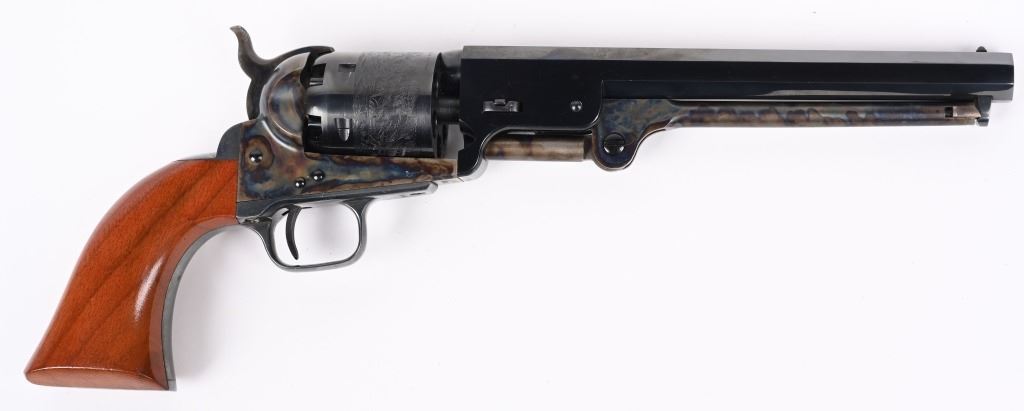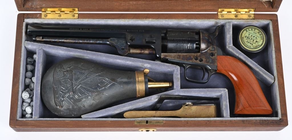 SERIAL 2556REL. BARREL 7.5". CALIBER .36. 4750 of these were made in 1971 only. Standard features include octagon barrel, blue and case color, silver plated trigger guard and back strap with one piece grips. Comes in the original wood display case with flash, mold, & cap tin. Condition. Near new, unfired with light handling. NO FFL