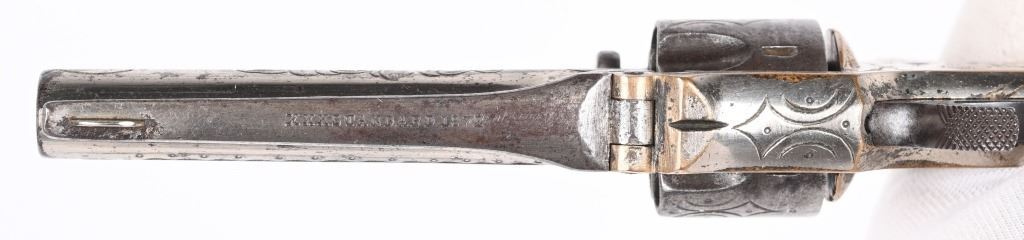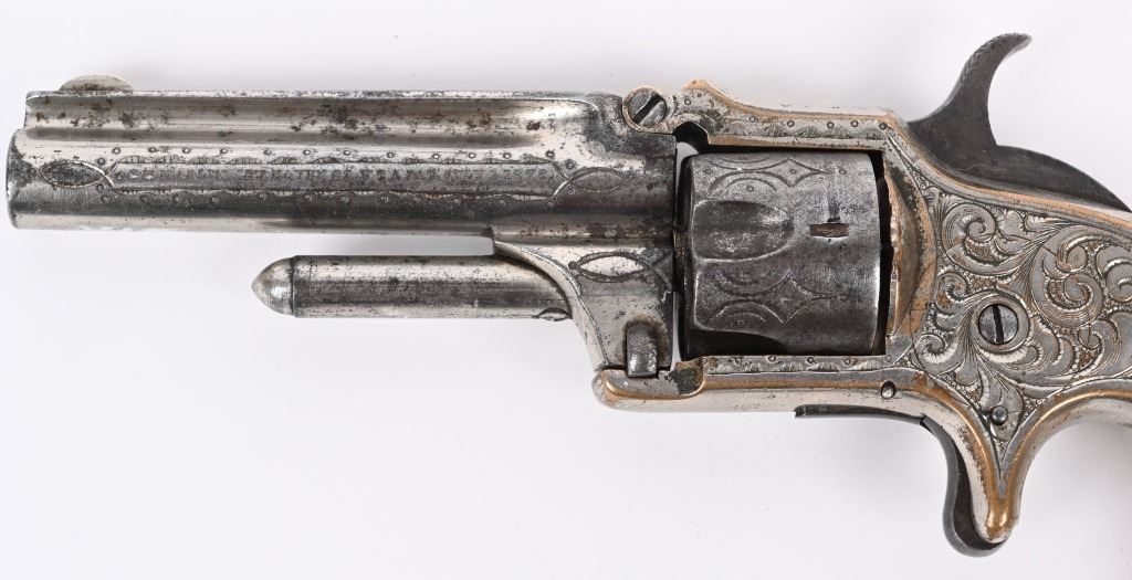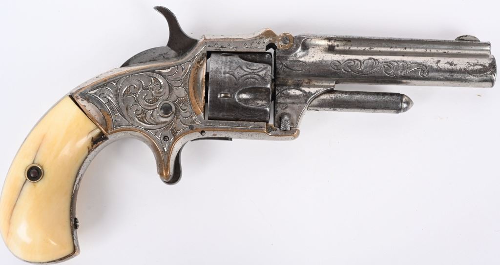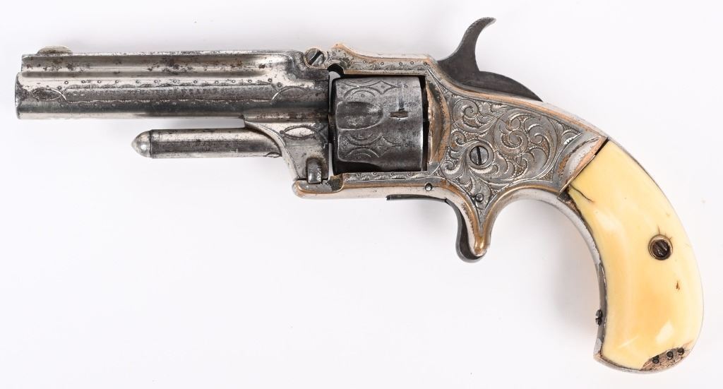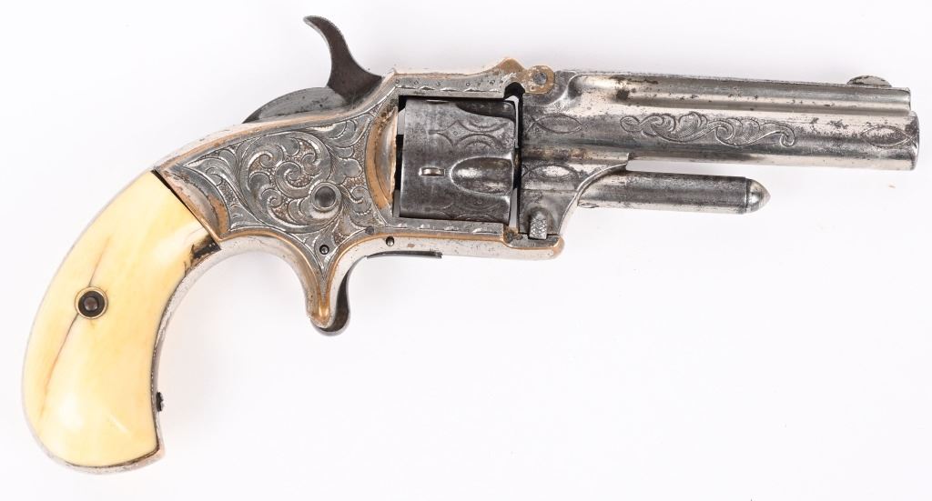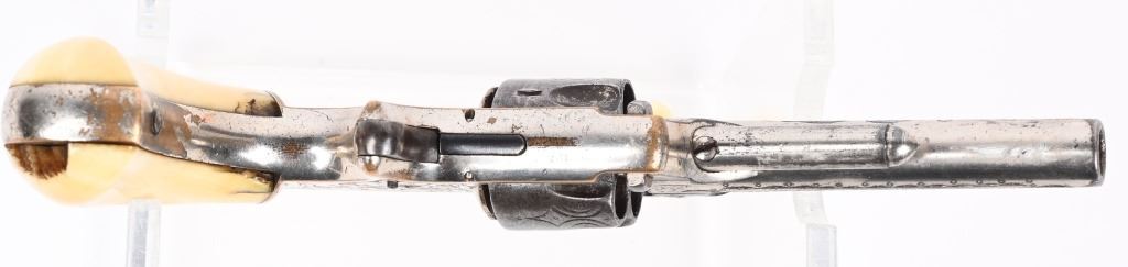 SERIAL 8995. BARREL 3". CALIBER 30RF. MADE 1873-76. Round barrel, ribbed, short flute cylinder, spur trigger, bird head ivory grips numbered to gun on right panel. Nickel finish, fully engraved in bank note American scroll. Condition. Cylinder is gray patina. Balance of gun retains about 75% nickel. Left ivory grip panel has small chip at base. Working order. Bore is excellent. ANTIQUE