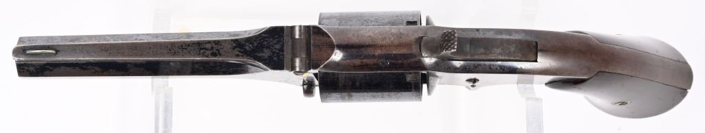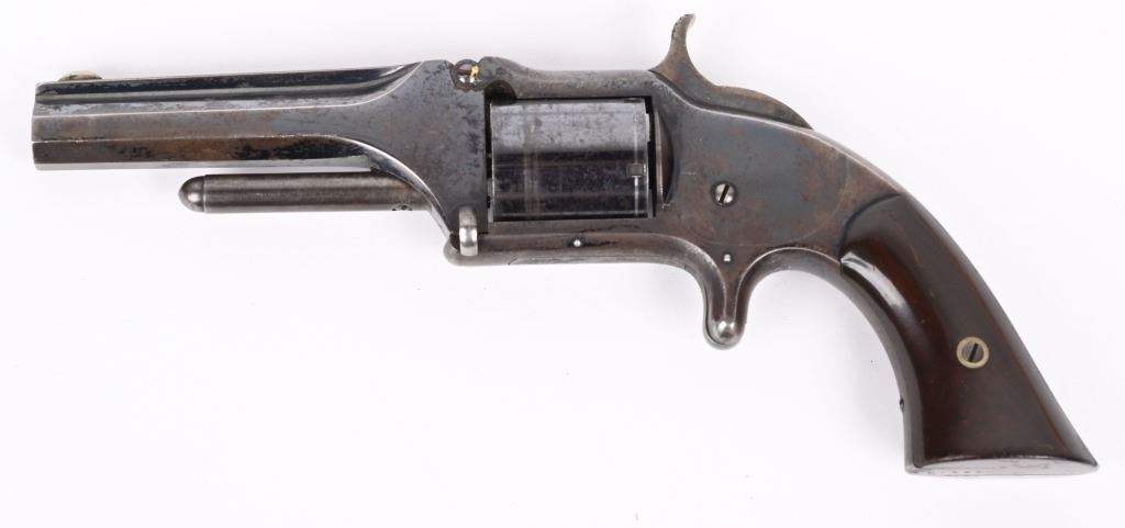 SERIAL 13435. BARREL 3.5". CALIBER 32RF. MADE 1865-68. Standard tip up, blue finish, spur trigger, two piece rosewood grips. Barrel has 1855 & 1859 patent dates only. Condition. Fine. Retains about 60-70 % bright blue with balance a smooth patina , mostly flaking, not wear. Grips are excellent. Nice colors on hammer. Indexes and locks up like new. Bore is sharp with very minor abrasion. ANTIQUE