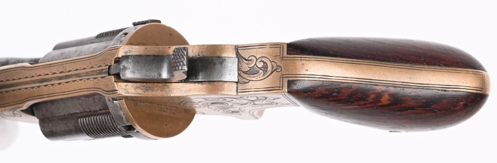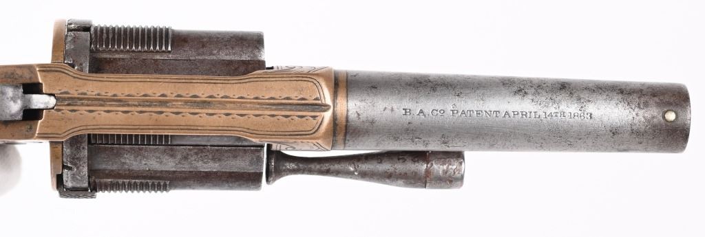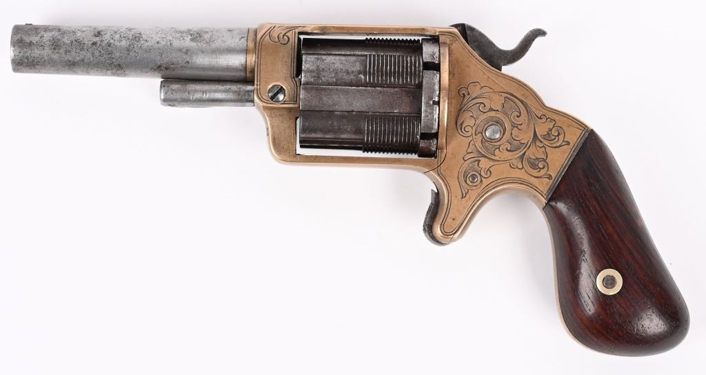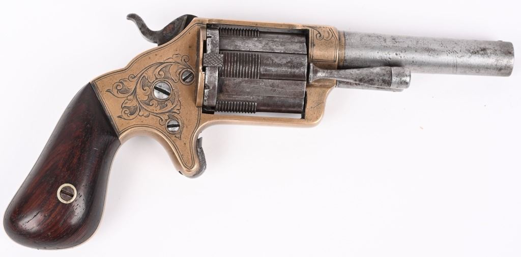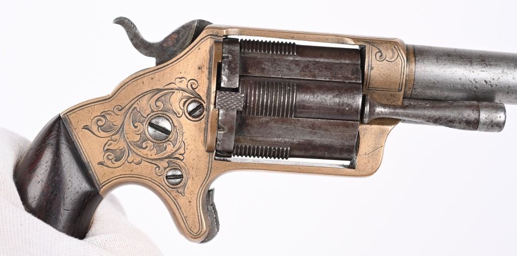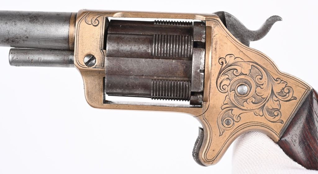 SERIAL 1502. BARREL 3". CALIBER 32RF. MADE 1863-64 ONLY. SLOCUM FRONT LOADING. Matching assembly number 29 on both grip panels and inside frame. Brass frame, engraved, spur trigger, five shot. Has forward sliding chambers. Rosewood grips. Condition. Excellent grips, toned brass with light floral bank note engraving, round barrel is gray patina as is cylinder. Cylinder does not index. Bore is sharp with minor abrasions. ANTIQUE
