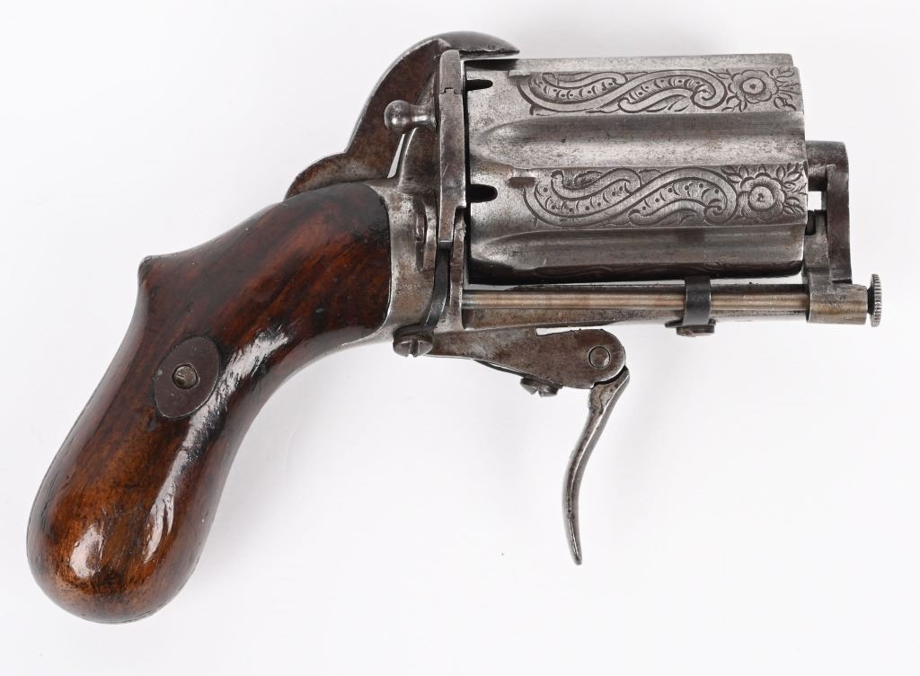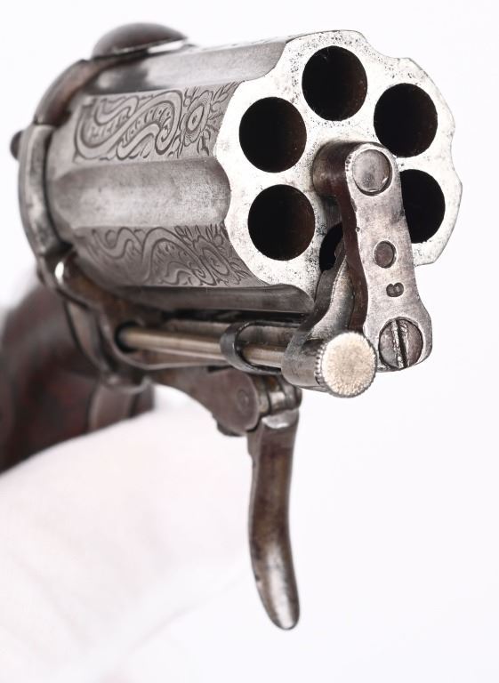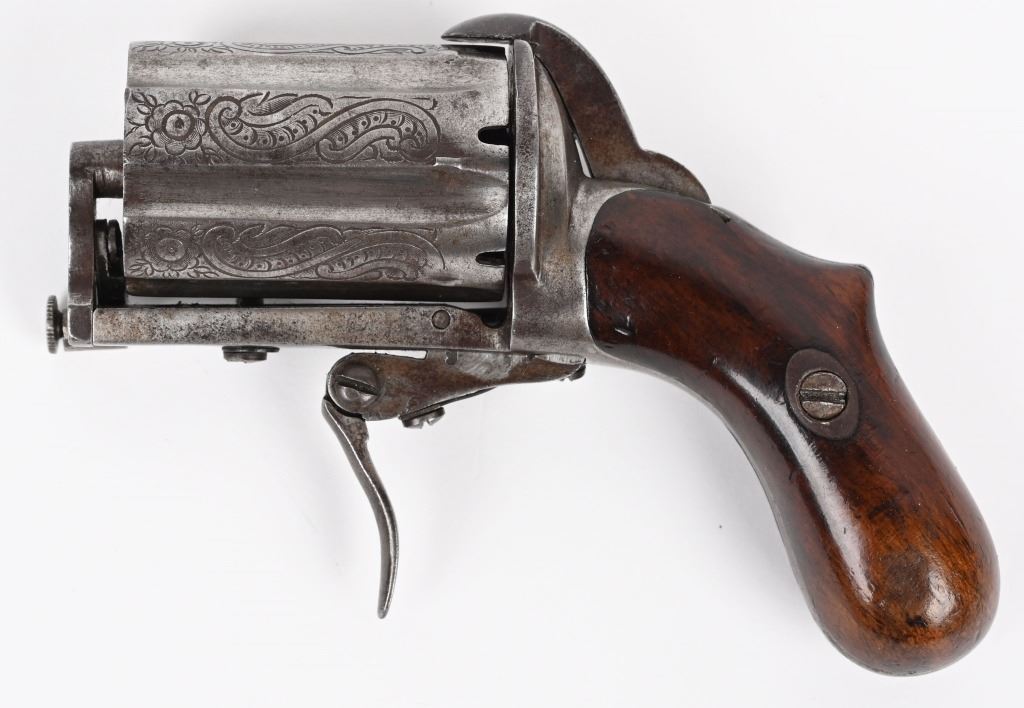 SERIAL 384-C. CALIBER 7MM. SIX SHOT, Folding trigger, walnut grips, engraved cylinder. Stamped Acier on flute. Condition. Overall smooth patina, engraved cylinder flats, excellent grips, fine working order. Interesting little palm size revolver. ANTIQUE