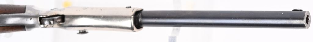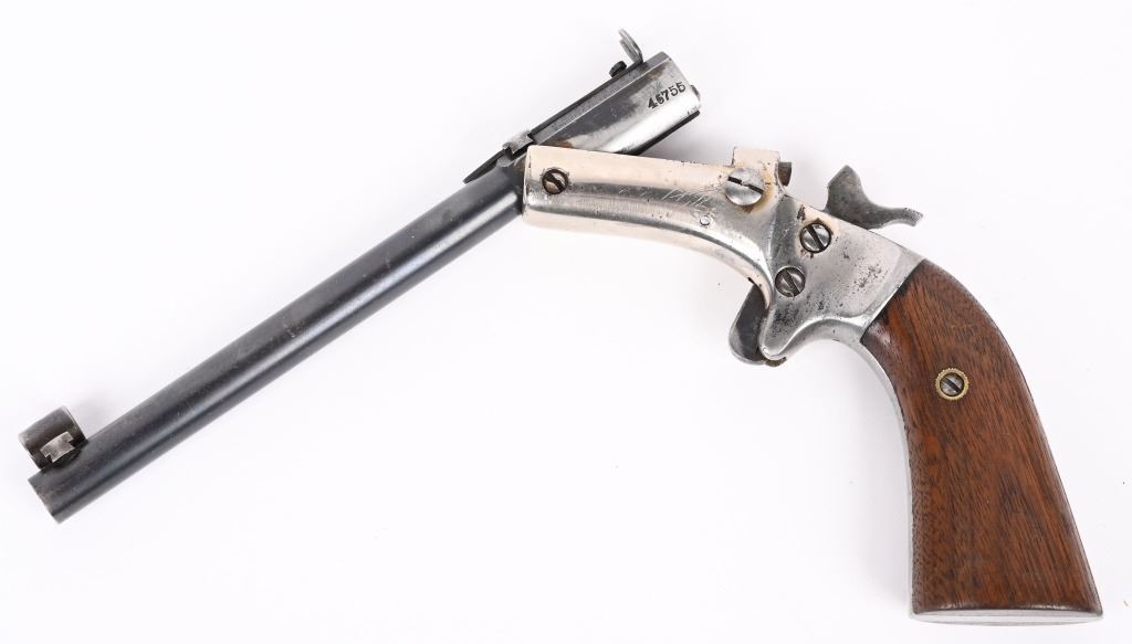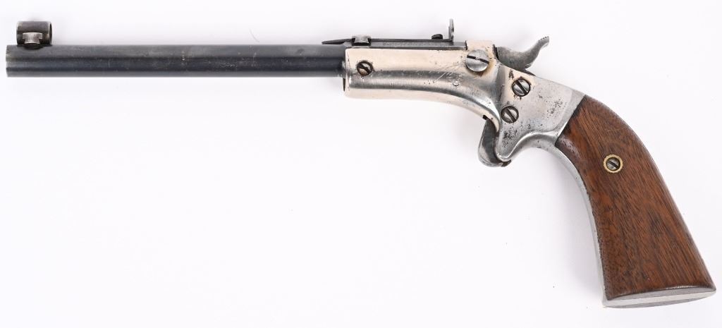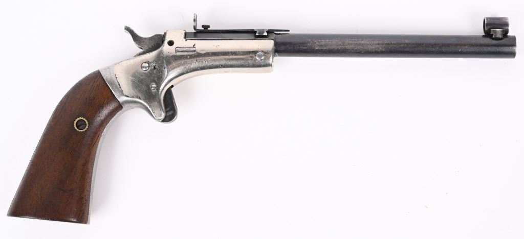 SERIAL 46755. BARREL 6" CALIBER 22. Single shot, blue barrel, nickel frame, walnut grips, target sight, globe front, intact extractor, spur trigger. Condition. Overall, 90% nickel and blue with excellent grips and bore. C&R