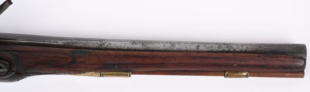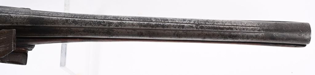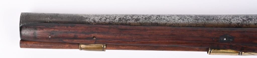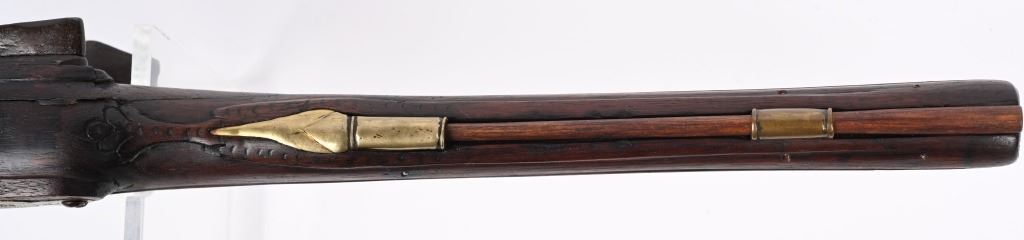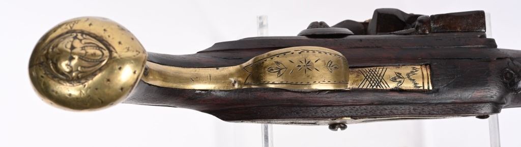 BARREL 12". BORE .65. Engraved breech and unmarked lock, Engraved brass furniture. Incised stock with small repair at guard. Condition. Fine patina, toned brass, overall excellent shape. ANTIQUE