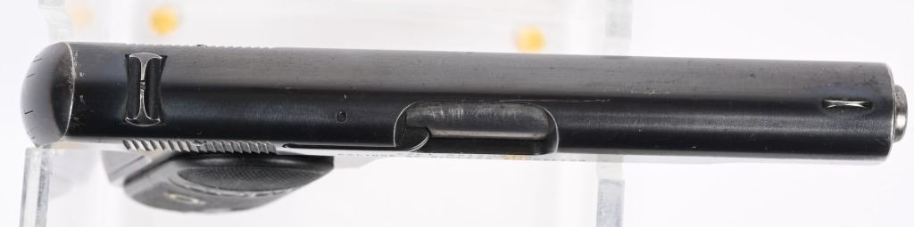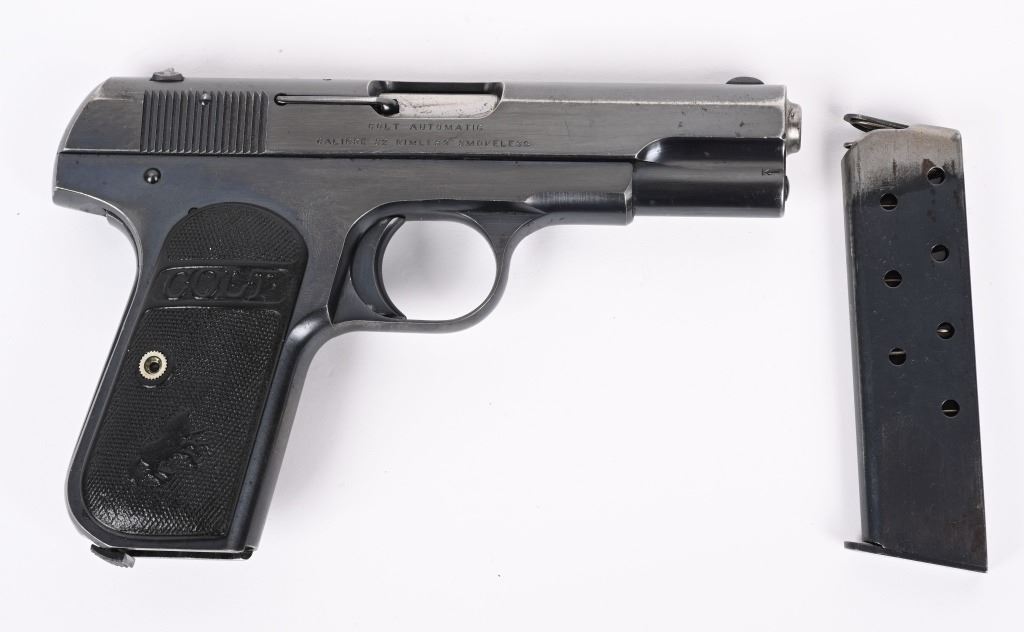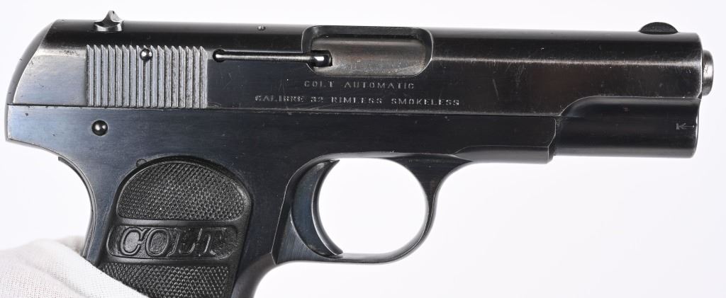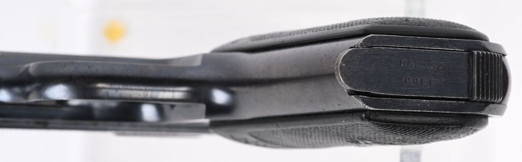 SERIAL 184331. BARREL 3.5". CALIBER .32 ACP. MADE IN 1915. Standard blue finish with Colt gutta percha grips and a two tone tempered magazine stamped on base cal. 32. Colt. Condition. Shows some high edge and muzzle wear. 90% blue on straps. Balance solid 95%. Excellent bore. Excellent grips. C&R