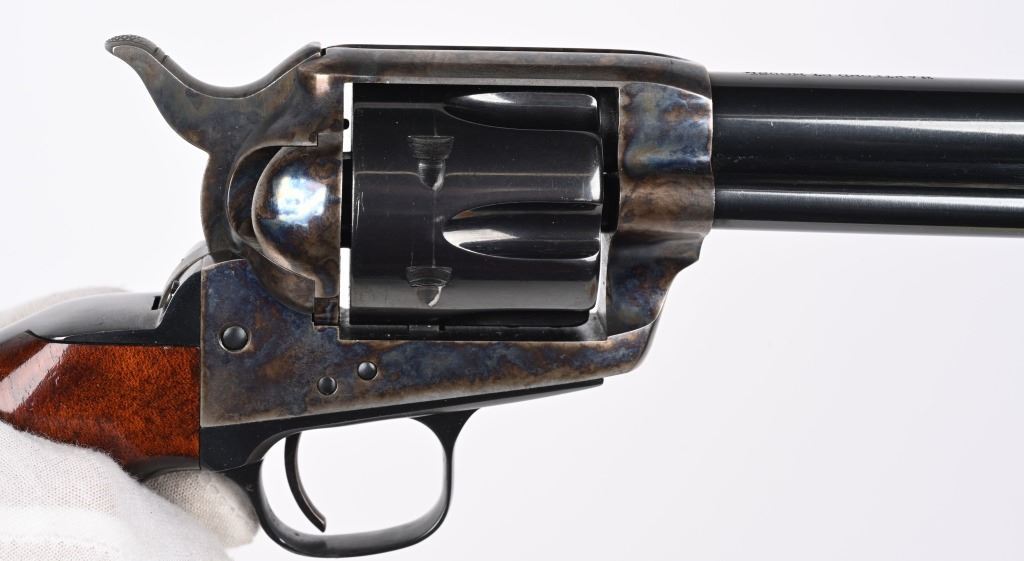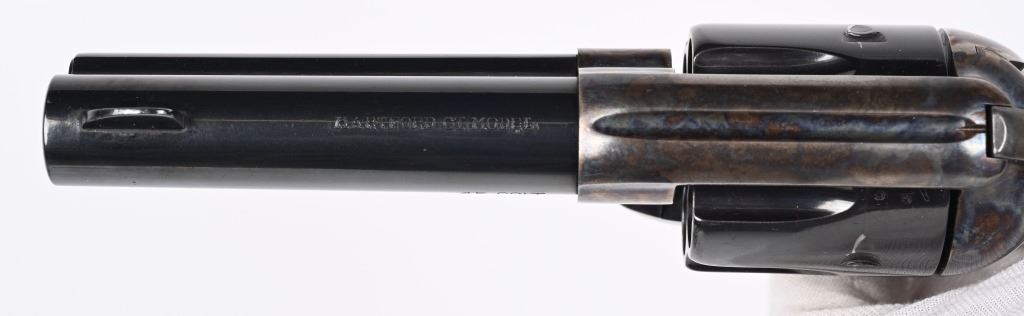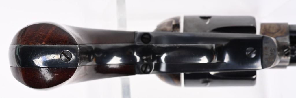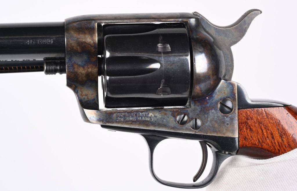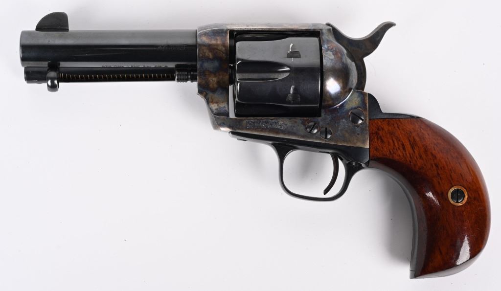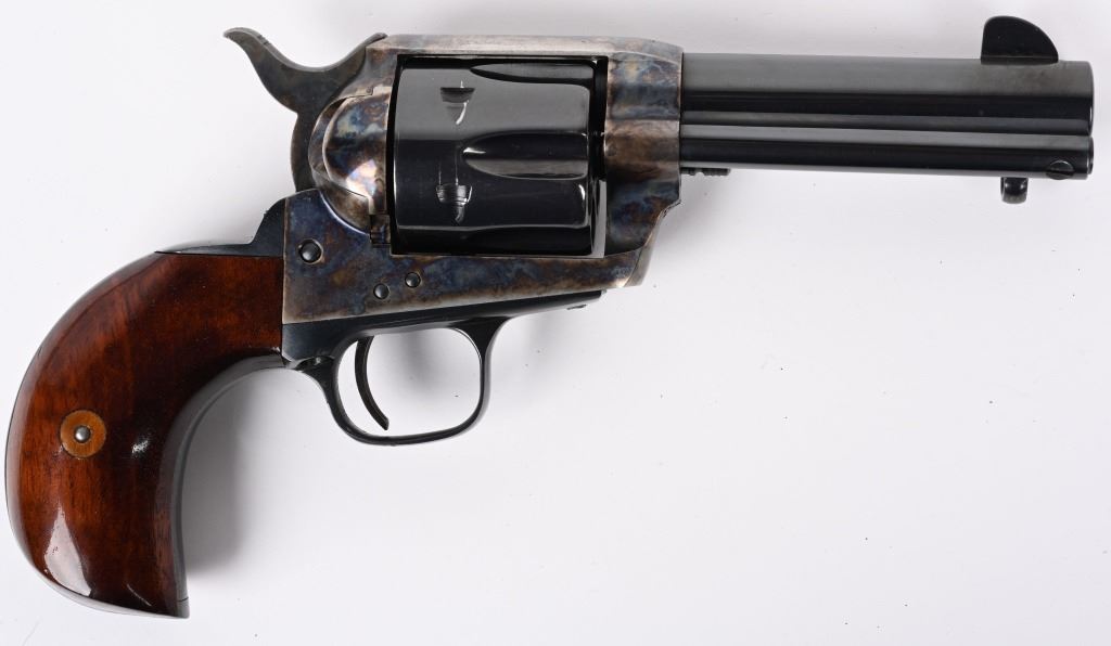 SERIAL NUMBER: SA18586. BARREL: 4". CALIBER: .45 COLT. MANUFACTURED: 1990'S. Made in Italy by Armi San Marco and imported by EMF. Six shot fluted cylinder. Blade sight and u-notch frame rear. Cylinder, barrel and grip straps are blued. Frame and trigger is case colored. Smooth finished oiled wood grips, on a birds head butt. CONDITION: Metal and grips are excellent overall, with a few handling marks. Bore is shiny with crisp rifling. Sharp mechanics. MODERN