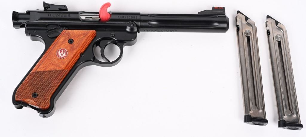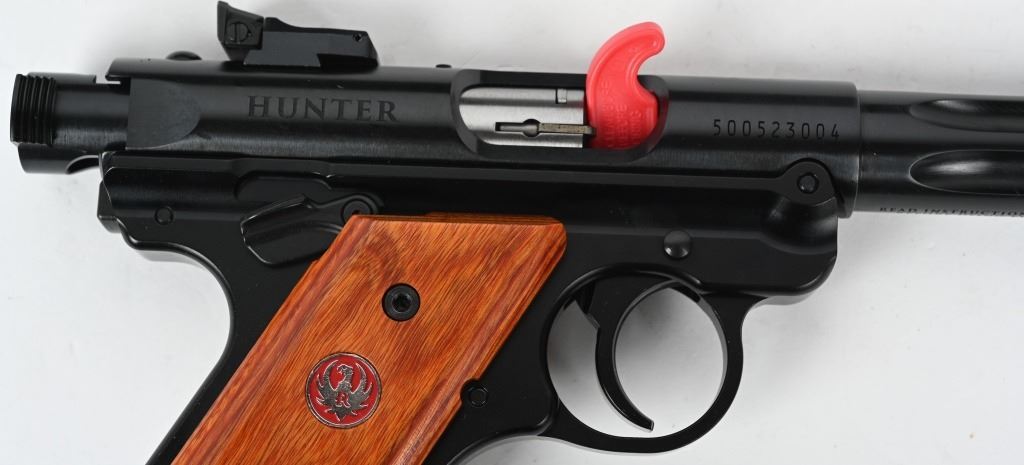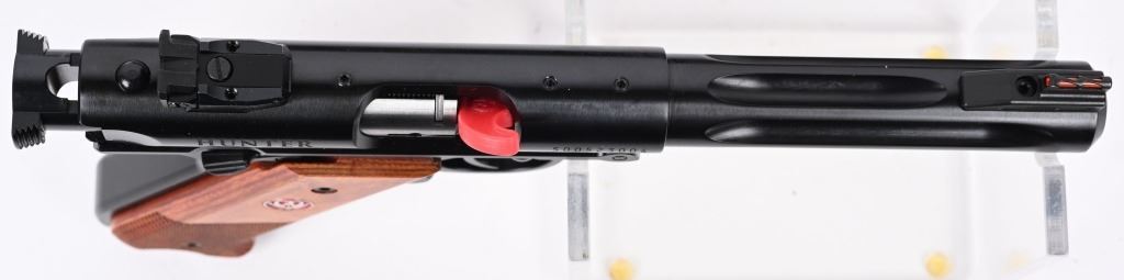SERIAL NUMBER: 500523004. BARREL: 5-1/2". CALIBER: .22LR. MANUFACTURED: 2020'S. Hunter model with a fluted barrel. Fiber optic blade front sight and adjustable u-notch rear. Original blued finish and wood grips with red phoenix medallions. Includes two factory 10 round metal magazines, lock, manual and serial matching hard case. CONDITION: Excellent overall, with little signs of handling or use. Bore is shiny with crisp rifling. Appears to be unfired from the factory. Mechanically fine. Magazines and case are excellent. MODERN