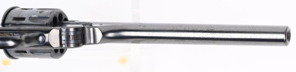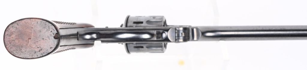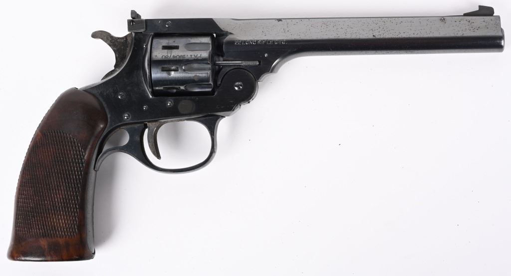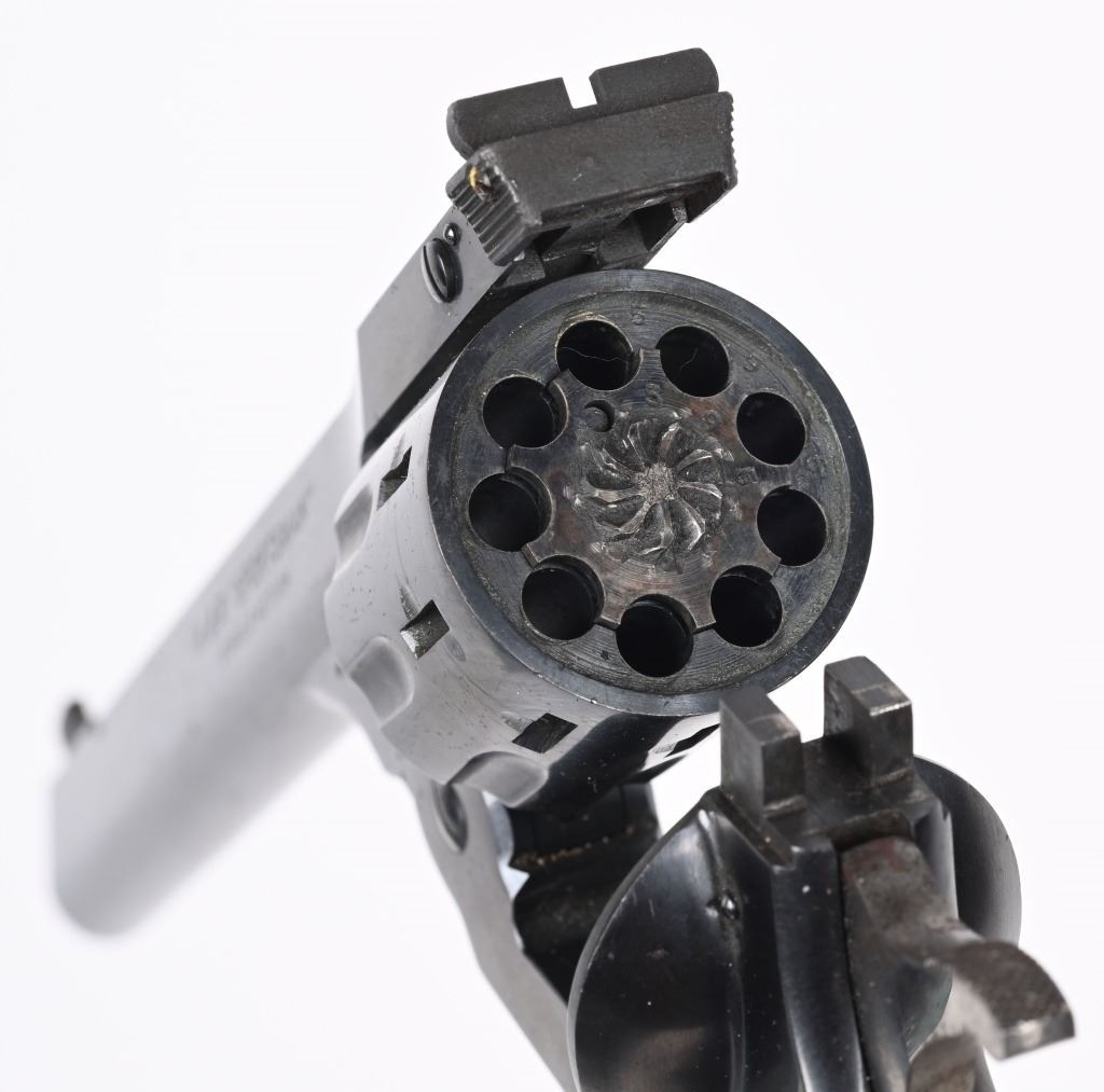 SERIAL NUMBER: S11595. BARREL: 6". CALIBER: .22LR. MANUFACTURED: 1956. Nine shot fluted cylinder. Matching serials on the frame, cylinder and cylinder face. Factory blued finish. Checkered oiled wood grip. CONDITION: Metal is fair, with pin pricks of surface rust throughout. Grips have a few light handling marks and scratches. Bore is shiny with crisp rifling. Cylinder does not rotate in single or double action, will need work. C&R