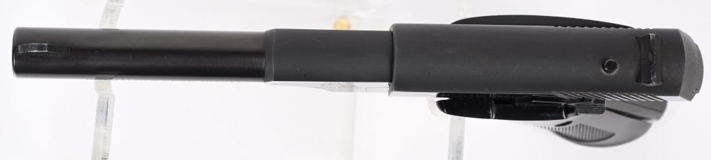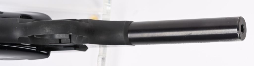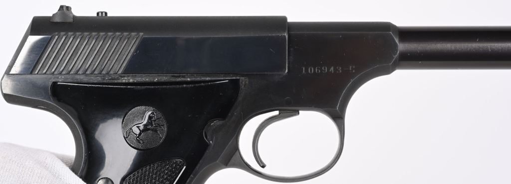SERIAL NUMBER: 106943-C. BARREL: 4-1/2". CALIBER: .22LR. MANUFACTURED: 1956. Standard markings and features. Rampant pony on the left side of the chamber, over "HUNTSMAN". Fixed blade front sight and adjustable u-notch rear. Factory blued finish and checkered black plastic grips. Includes factory blued steel magazine, marked "COLT/CAL..22 L.R. on the bottom. CONDITION: Metal is very good overall with light wear, and a few minor scratches. Grips are excellent overall. Bore is shiny with crisp rifling. Mechanically fine. Magazine has light wear. C&R