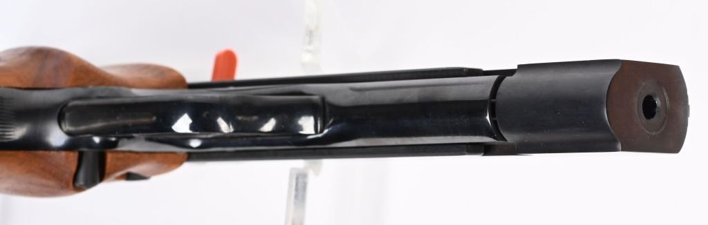SERIAL A779489. BARREL 5.5". CALIBER 22LR. Magazine fed (included) semi auto target pistol with blue finish, walnut grips, target sights. Condition. As new with light handling in original matching box with paperwork. MODERN