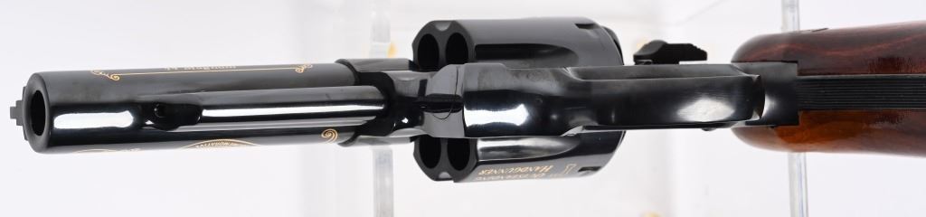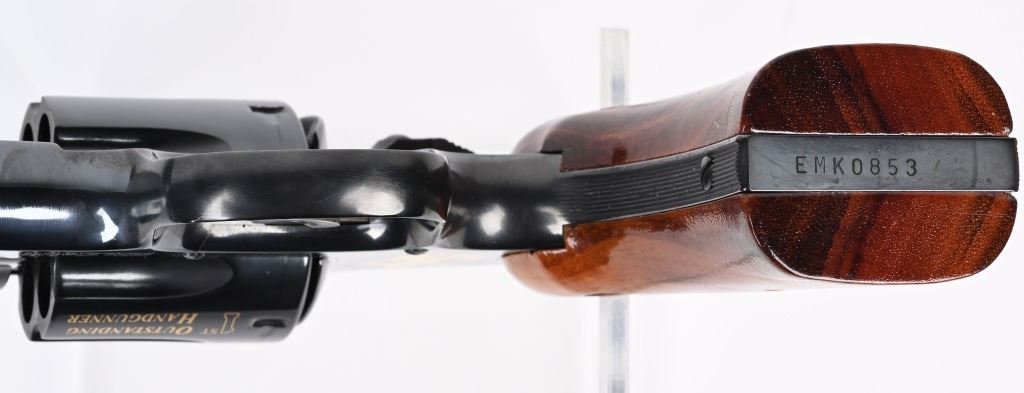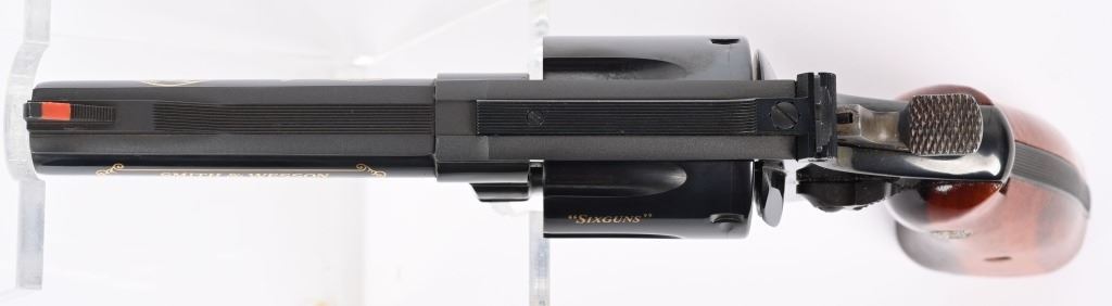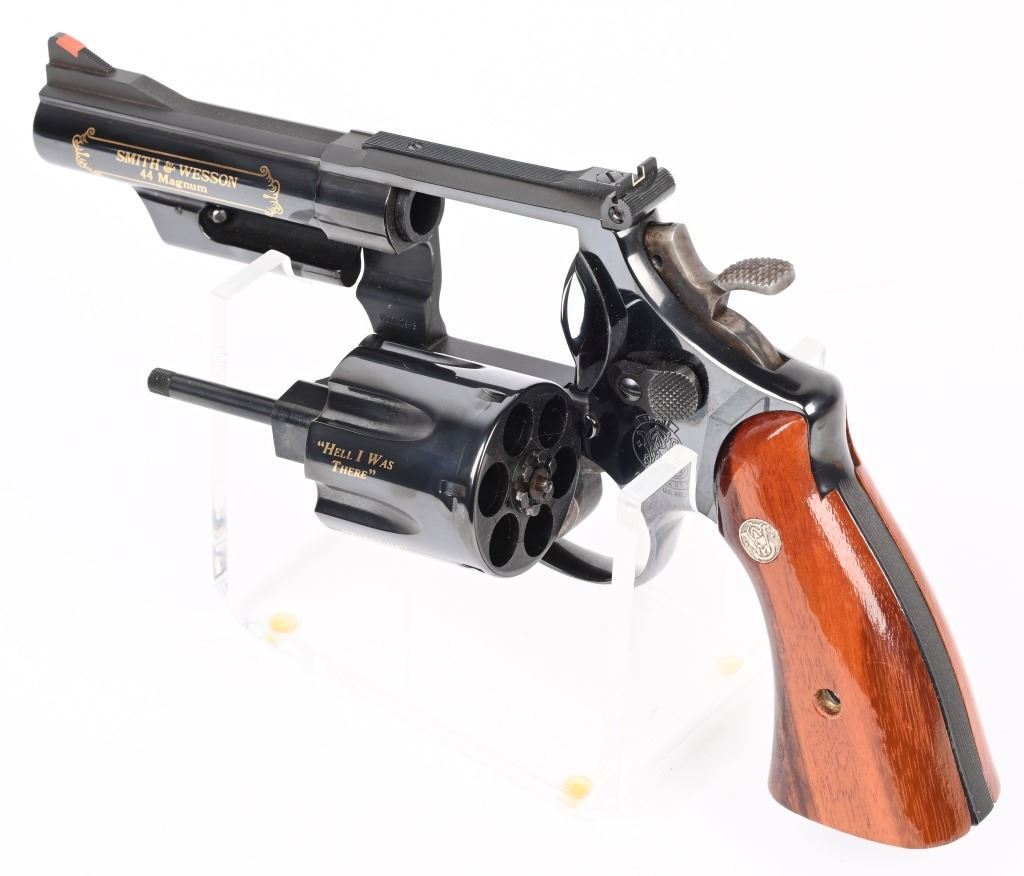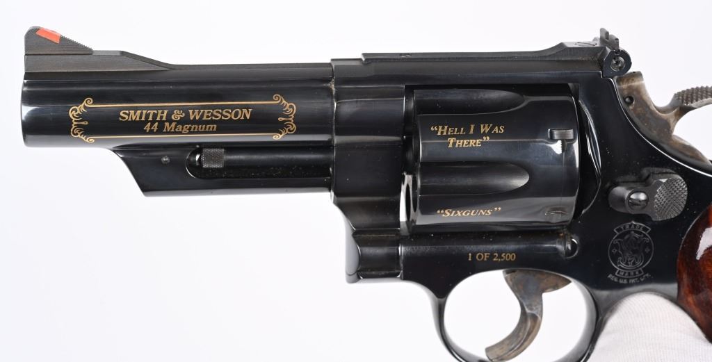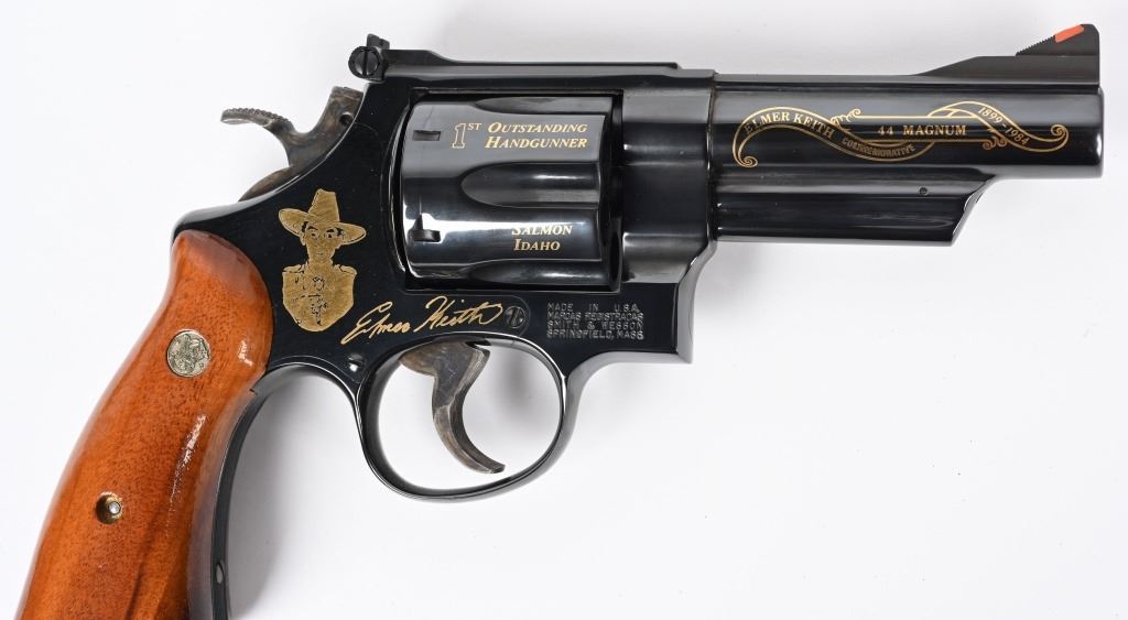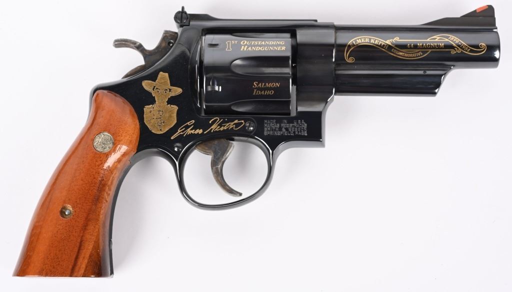 SERIAL EMK0853. BARREL 4". CALIBER .44 MAGNUM. MADE 1985. The left side of the barrel is marked “SMITH & WESSON / 44 Magnum” in gold, the right is marked “ELMER KEITH COMMEMORATIVE”, “44 MAGNUM”, and “1899-1984” in gold on a banner. The left side of the frame is marked with S&W’s monogram logo. “1 OF 2,500” is marked in gold under the cylinder on the left. The right is marked with the four line Marcas Registradas. The right side plate is marked with a portrait of Elmer Keith and his signature in gold. The cylinder is marked “1ST” “OUTSTANDING / HANDGUNNER” and “SALMON / IDAHO” in gold on the right and “”HELL I WAS / THERE”” and “”SIXGUNS”” in gold, on the left. Smooth walnut grips. Target rear sight with red insert front. Case color hammer & trigger. No display case. Condition. Aside from light drag line, near new . MODERN