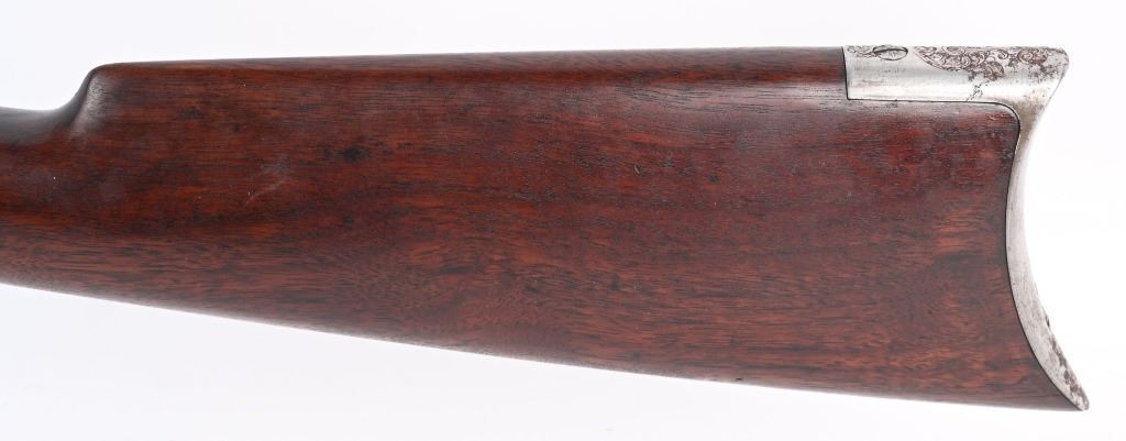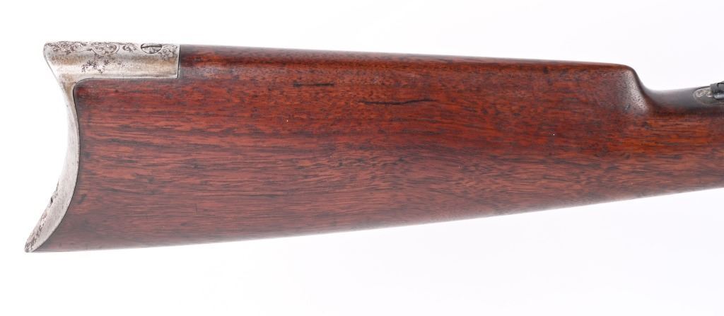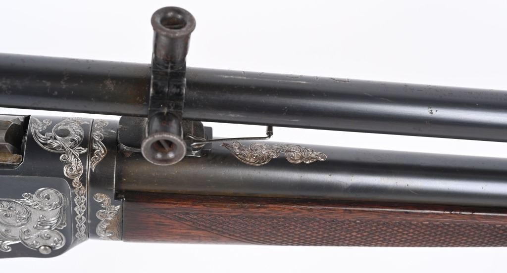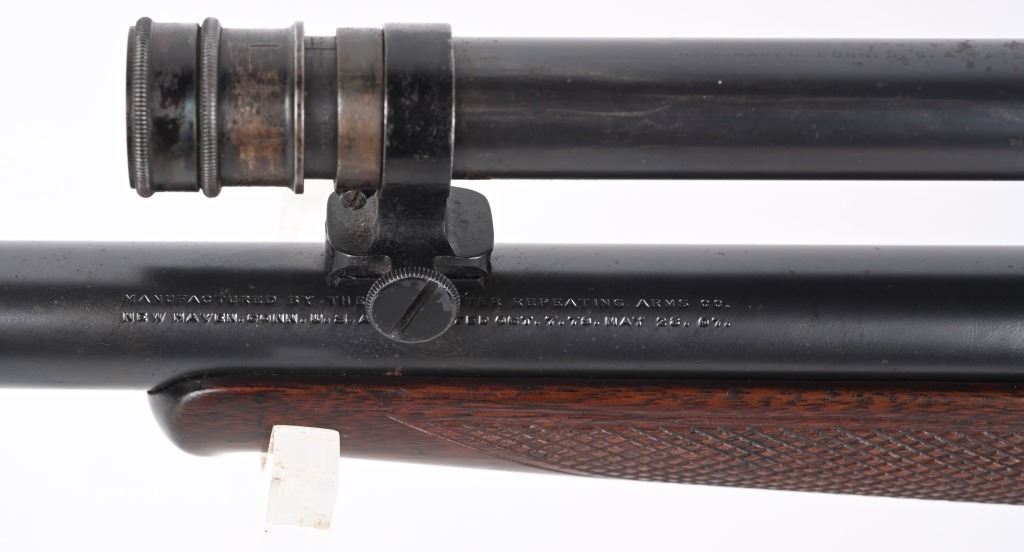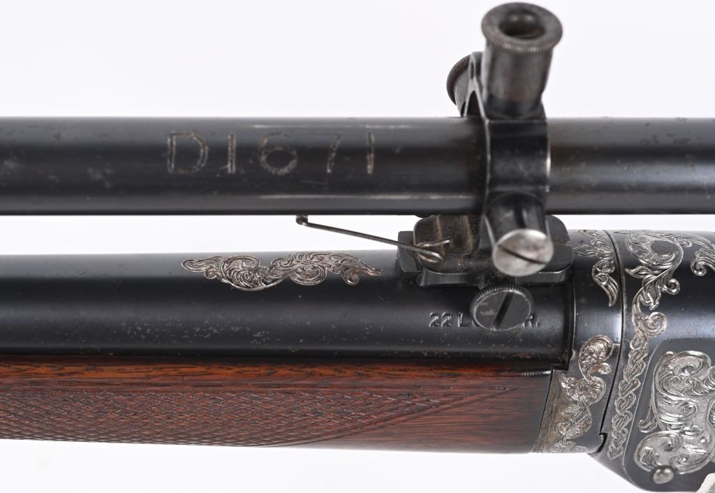 SERIAL 108854. BARREL 27 3/4". CALIBER 22 LR MADE IN 1918. Features checkered walnut fore-arm with ebony tip, standard butt stock with rifle butt plate, gold bead sight on base, tang sight, period Winchester A-5 scope with original grasshopper spring mounts. This is a take down model with bank note scroll engraving on barrel breech, take down ring, frame, lever and butt plate. Standard blue finish. Scope has cross hair reticle with clear optics with D1671 etched on tube. Condition. Solid 95% plus metal with few freckles. Barrel legends sharp. Engraving is master class work. Wood is excellent. Bore is strong. C&R