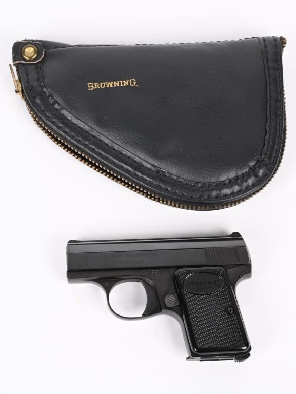 SERIAL 354221. BARREL 2". CALIBER .25ACP. MADE 1966. Standard blue with fixed sights, Browning black plastic grips, one magazine in Browning pouch with paperwork. Condition. Near new. C&R