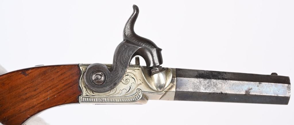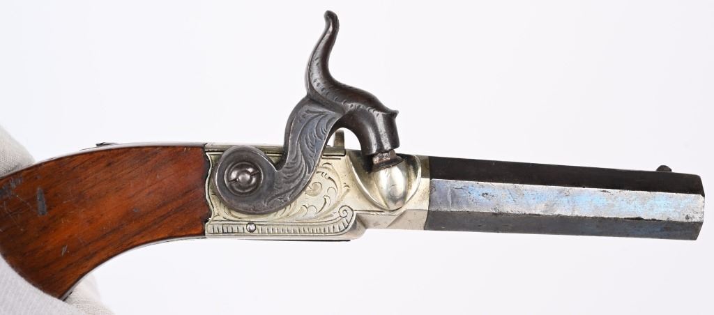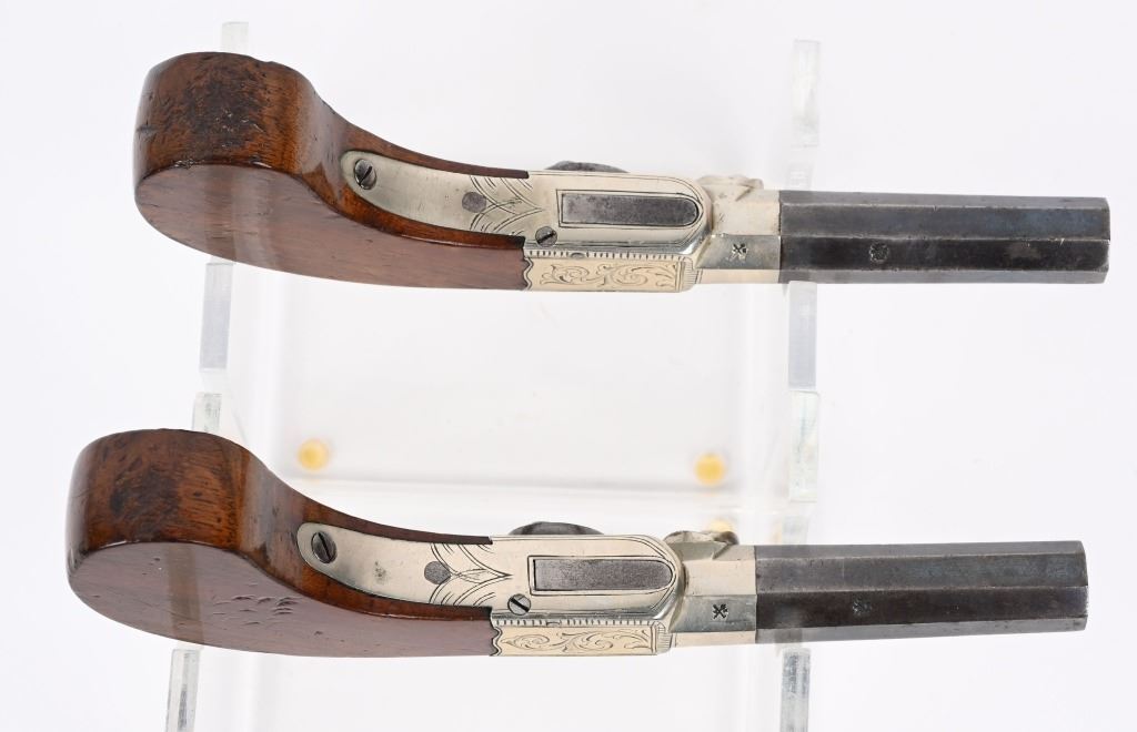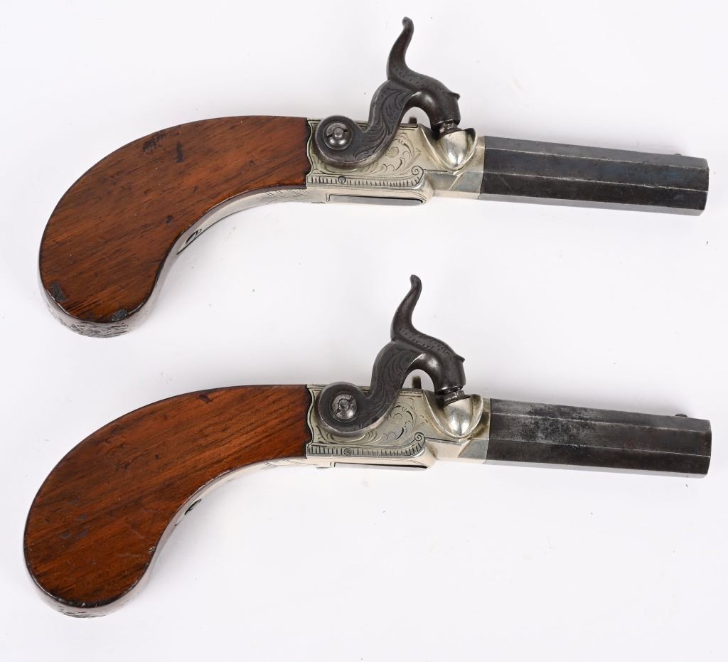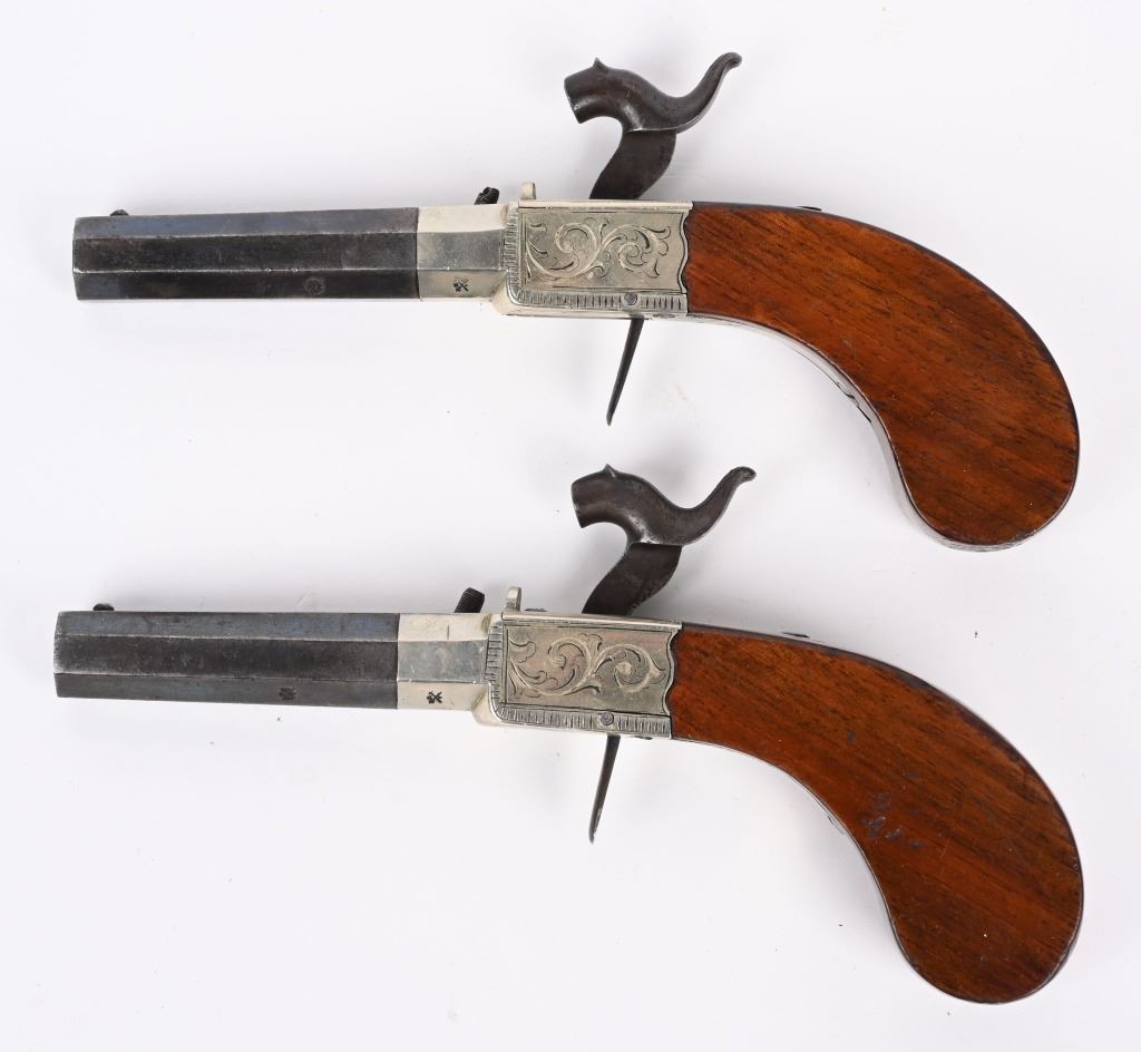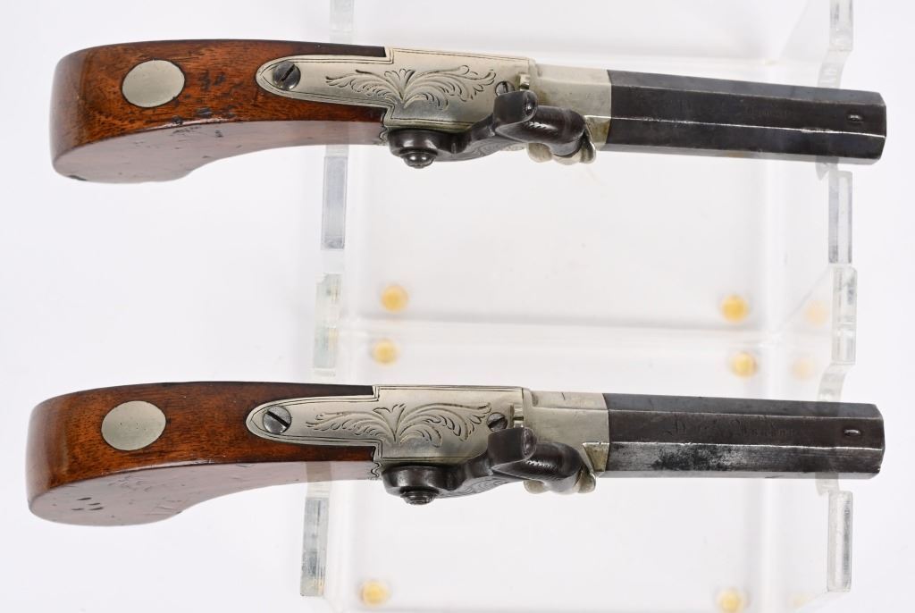 Matching pair with 2.5" blued octagon barrels, 40 caliber, engraved nickel plated frames, one piece bag style handles, percussion, folding triggers. Condition. Overall, 50% high polish blue, 98% nickel, grips have minor dings. Both have British proof stamps and are stamped Nock London on top of barrels. Both are in fine working order. ANTIQUE