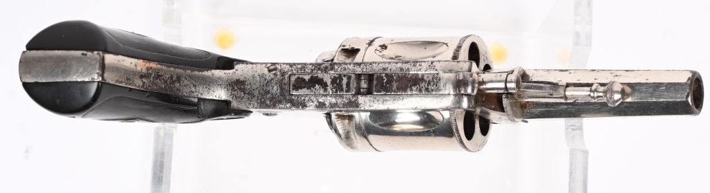 SERIAL NSN BARREL 2 3/8". CALIBER 8 MM, Five shot, double action, folding trigger, nickel finish, octagon barrel and black gutta percha grips. Frame stamped with trade mark and caliber only. The Velo-Dog (also known as a Revolver de Poche[1]) was a pocket revolver originally created in France by René Galand, son of Charles-François Galand in the late 19th century as a defense for cyclists against dog attacks.[2] The name is a compound word composed of "velocipede" and "dog" wiki CONDITION. Very fine with 85% nickel remaining mixing patina. Fine action and bore. Grips have two minor chips at upper frame. Trigger will not stay closed. C&R