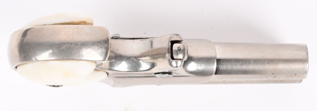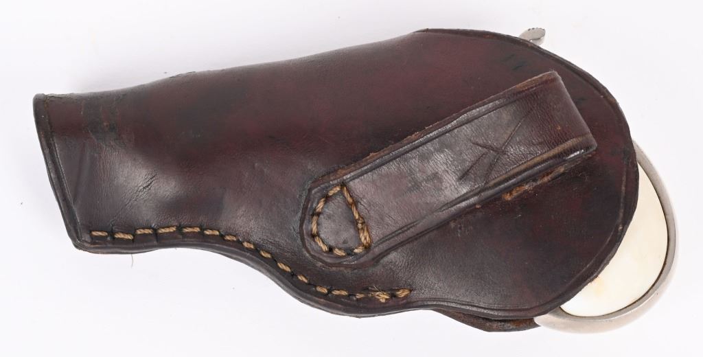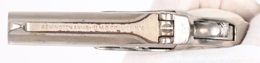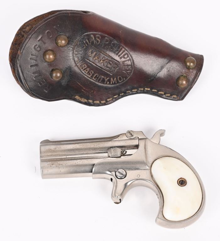 SERIAL L90720. BARREL 3". CALIBER .41 RF. TYPE 3 BARREL ADDRESS. Nickel plated with replaced ill fitting bone grips. Frame re nickeled, hinge intact, legends sharp, bore clean, locks up tight. The best part of this lot is the antique Chas. P. Shipley KANSAS CITY MAKER holster with sharp cartouche and REMINGTON stamped at top and decorated with period brass tacks. Shipley opened his KC shop in 1884, Killer holster in excellent condition. C&R