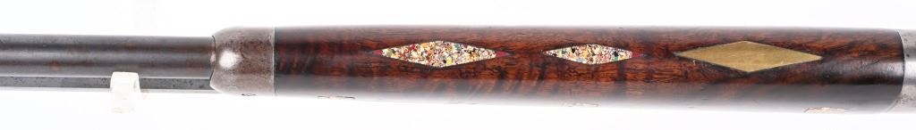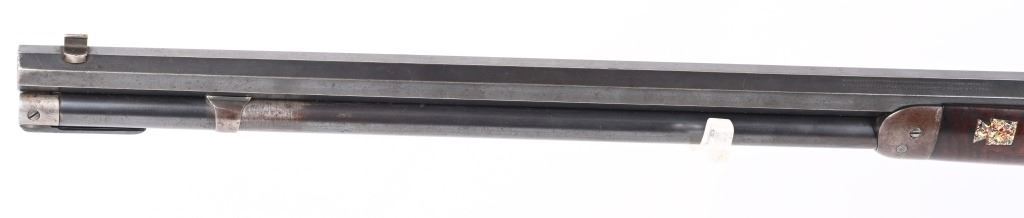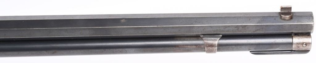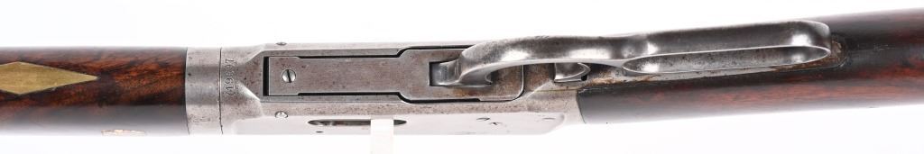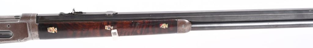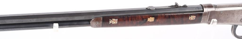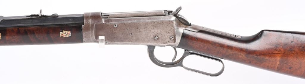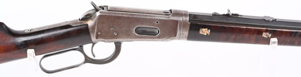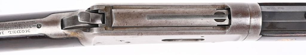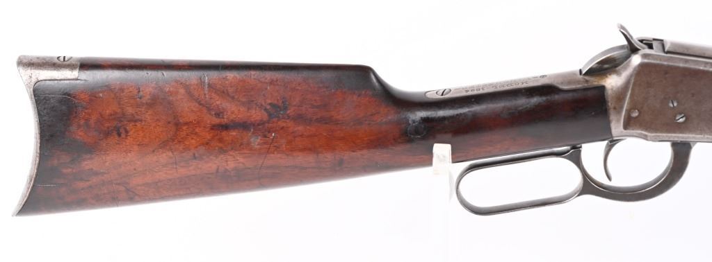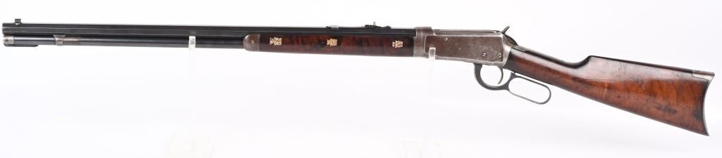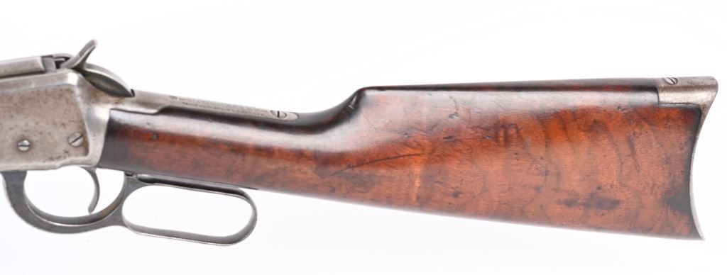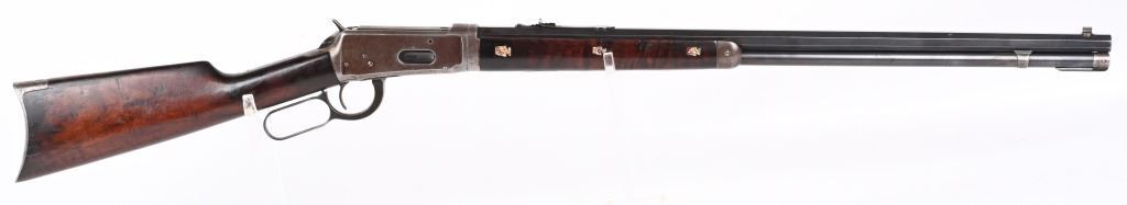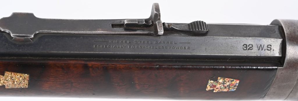 SERIAL 719697. BARREL 26". CALIBER 32WS. MADE IN 1914. Features full octagon barrel, full magazine tube, walnut stocks, rifle butt plates, sporting sights, blue finish, take down. Forearm has eight Penn. Keystone type brightly colored insets. Stock is flush to metal. and is in excellent condition sans a few usual bruises and impressions. Barrel and tube retain at least 90% blue finish. Frame is gray patina. Action is fine and bore is bright. C&R