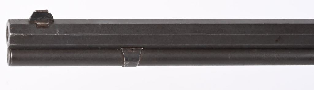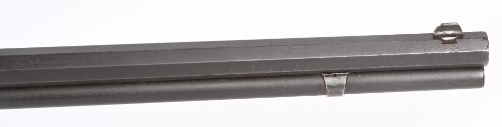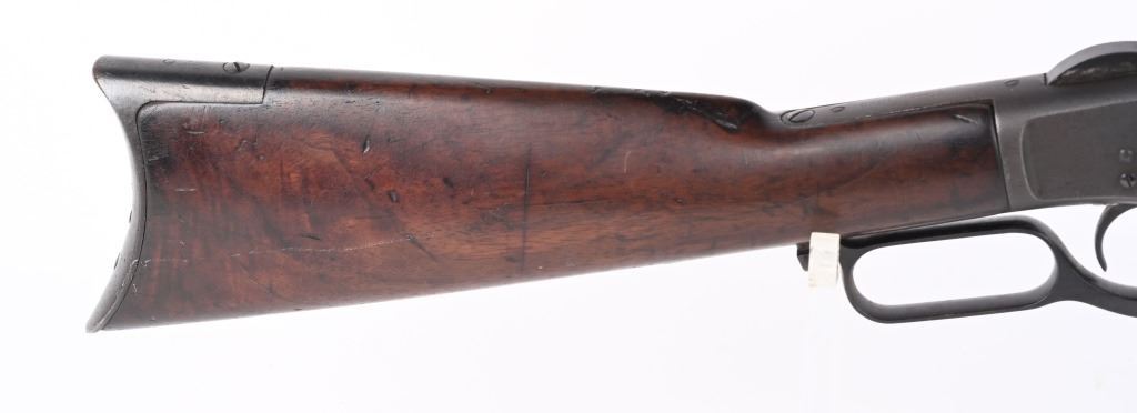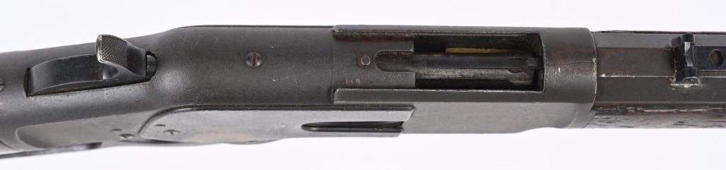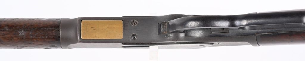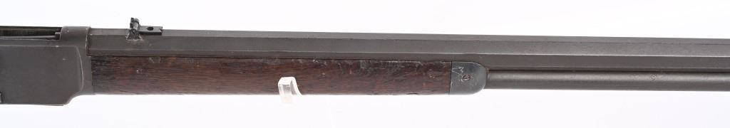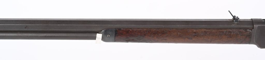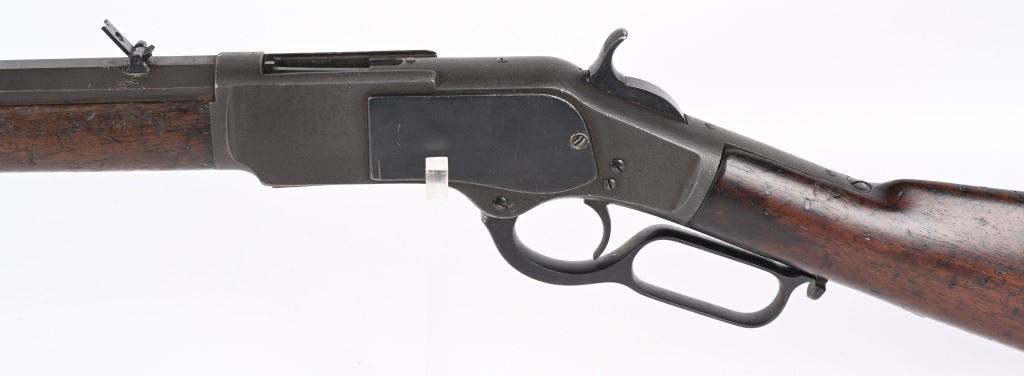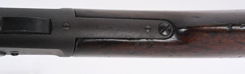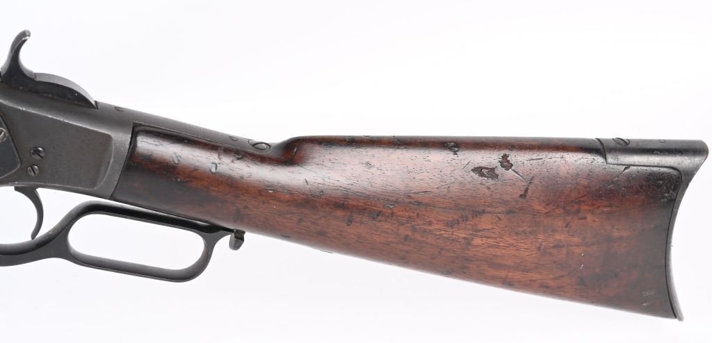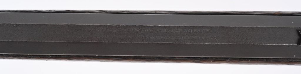 SERIAL 656. BARREL 24". CALIBER 44-40. MADE IN 1874. Very early standard rifle with no caliber markings (correct) no dust cover rail but missing thumb print cover. Two line Kings patent 1860 barrel address on full octagon barrel, full magazine, walnut stocks, rifle butt plate with trap door. Two leaf 1866 style replaced rear sight, Condition. Metal is dark even patina. Barrel legends are crisp. fine working order. Stocks are shy to metal , refinished long ago with numerous small dents and impressions. Forearm has a hairline crack running full length at base. Bore has surprisingly crisp lands with frosted grooves and minimal abrasions. Basically an honest first with few issues but very, very early gun. ANTIQUE