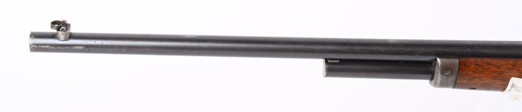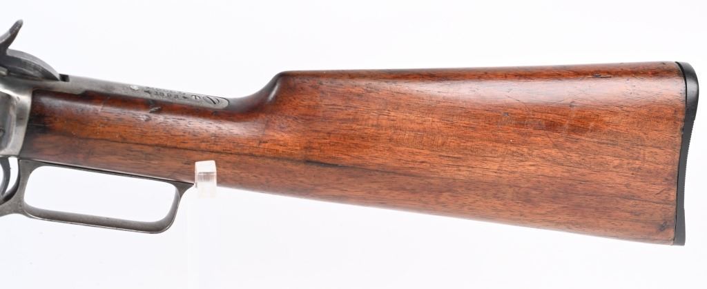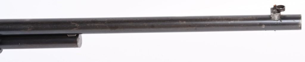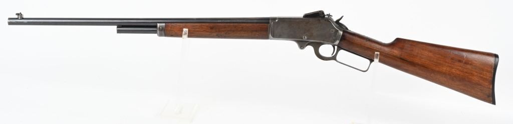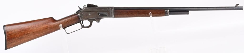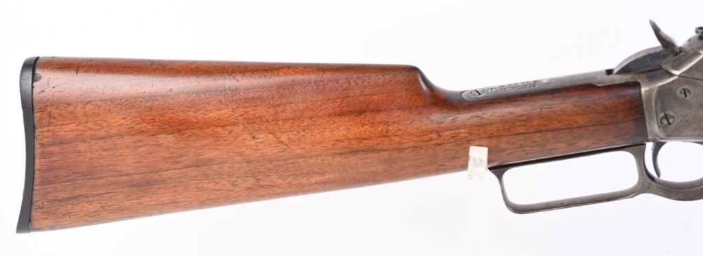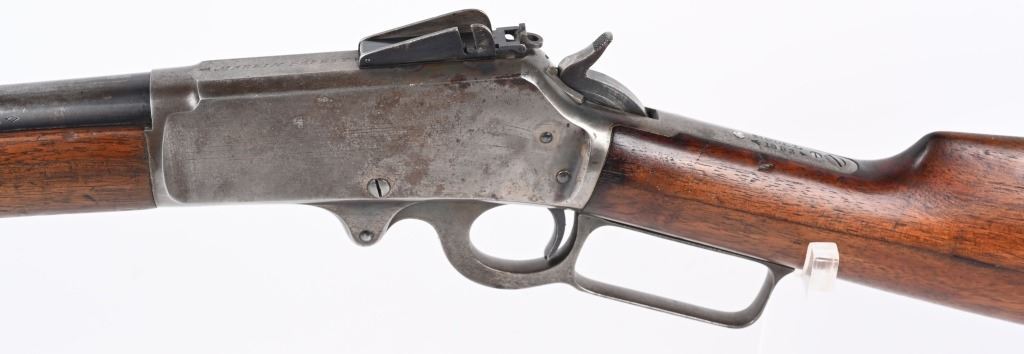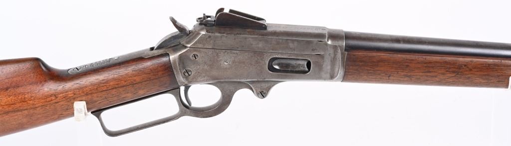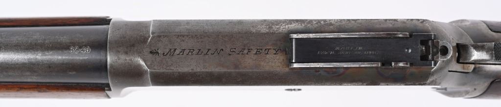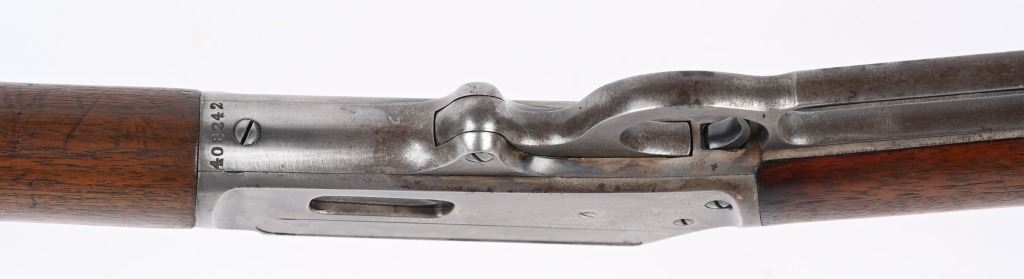 SERIAL 408242. BARREL 22". CALIBER 32-40. Special order short rifle, round barrel, half magazine Marlin patent receiver sight, no provision for rear barrel sight, special order folding globe front sight, walnut stocks shotgun butt plate, blue with case color frame, lever & hammer. Condition. Frame basically nickeled out with flashes of color in protected areas. 75% thinning blue on barrel & tube. Wood is excellent with some impressions & toe of stock has a repair. Bore is strong. Butt plate does not say Marlin. C&R