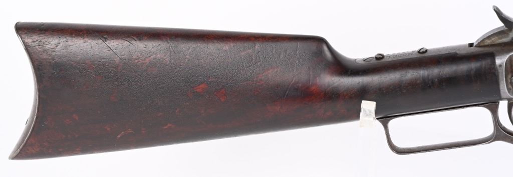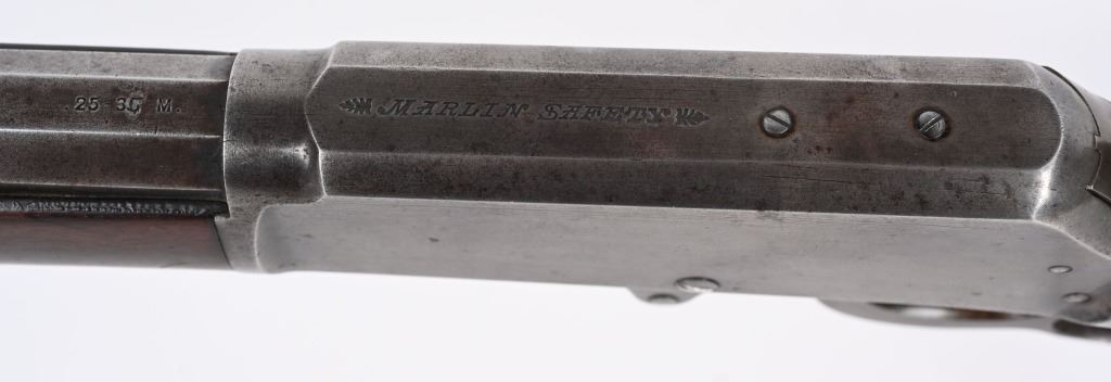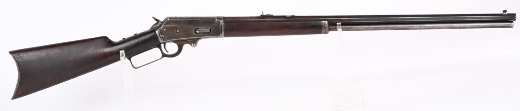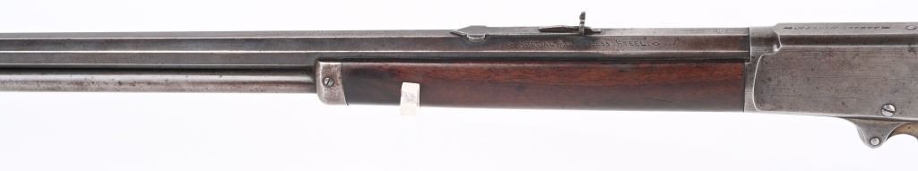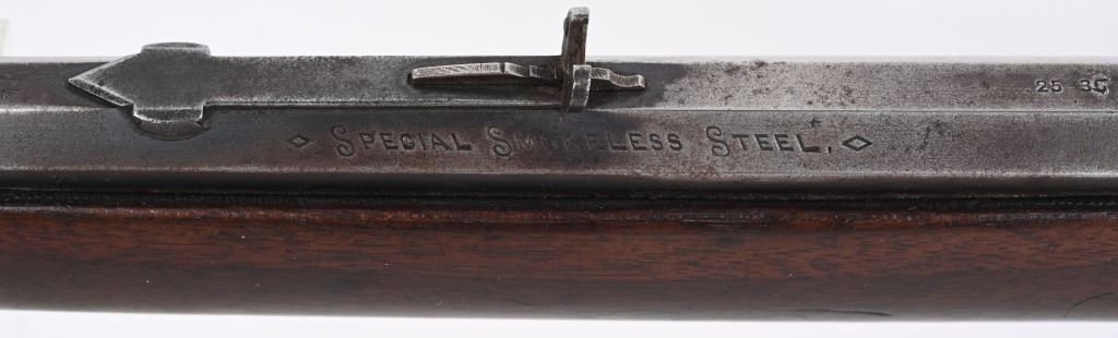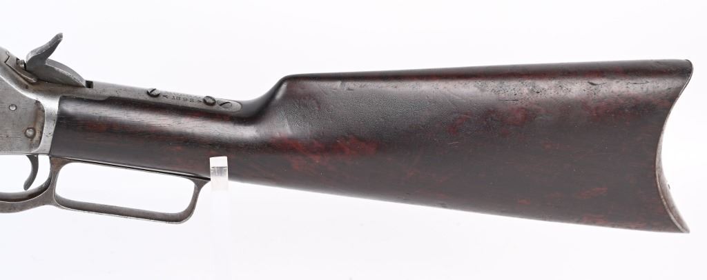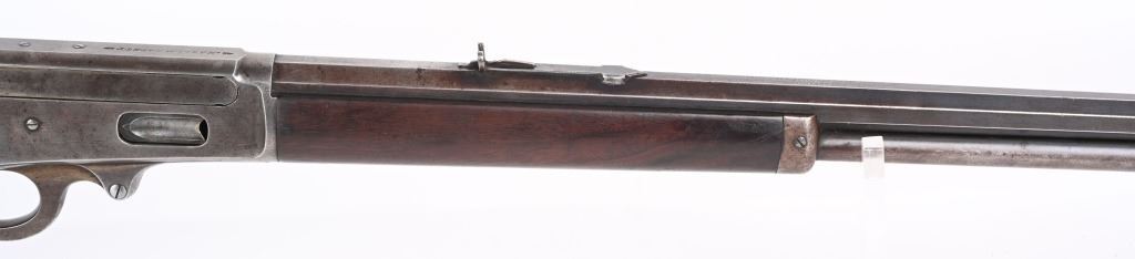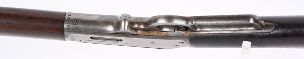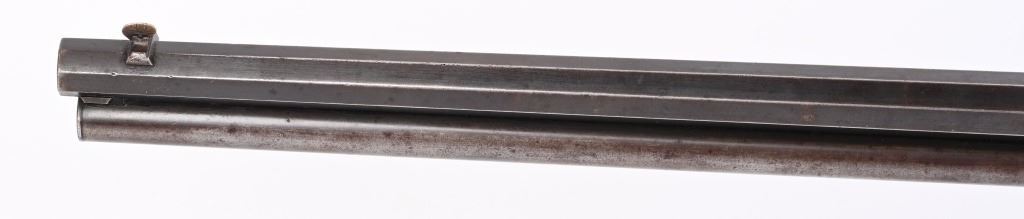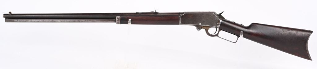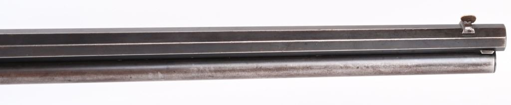 SERIAL 441157. BARREL 26". CALIBER 25-36. Features full octagon barrel, full magazine, correct sporting rear sight, period home made brass front sight blade, tang screws for sight but no sight, walnut stocks, rifle butt plate, standard blue and case color finish. Condition. No case colors remain, now has a nickel appearance. Tube is brown patina. Barrel is about 70% blue with balance patina. Tube is brown patina. Wood is excellent. Someone over stamped the 6 in 36 and looks to be period. Bore is sharp. C & R r