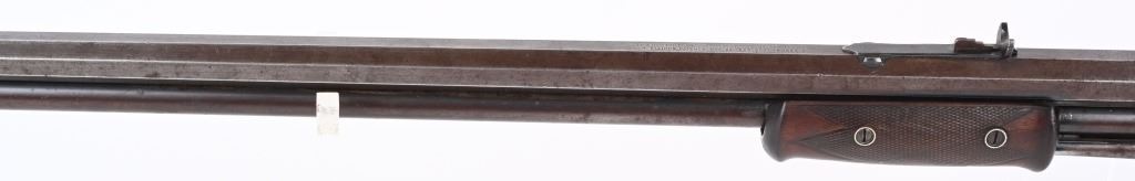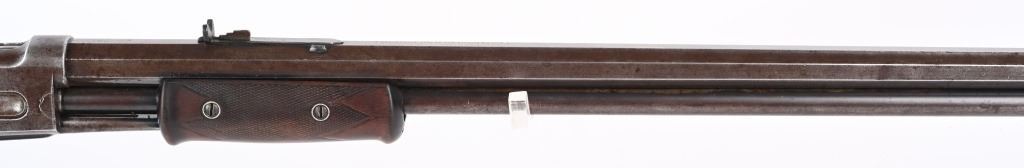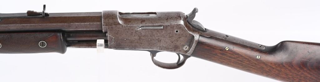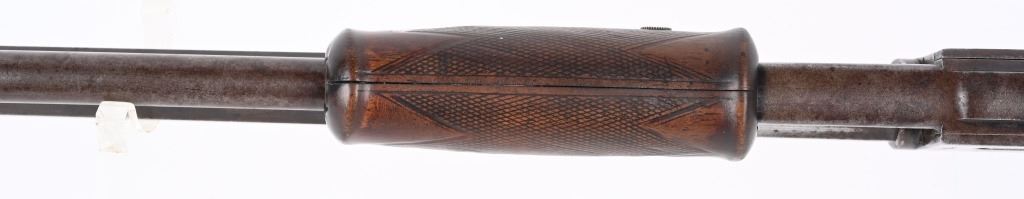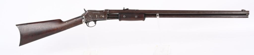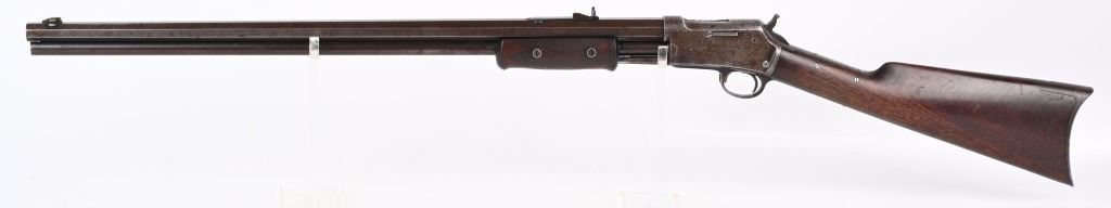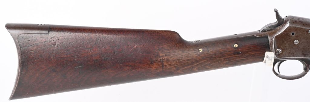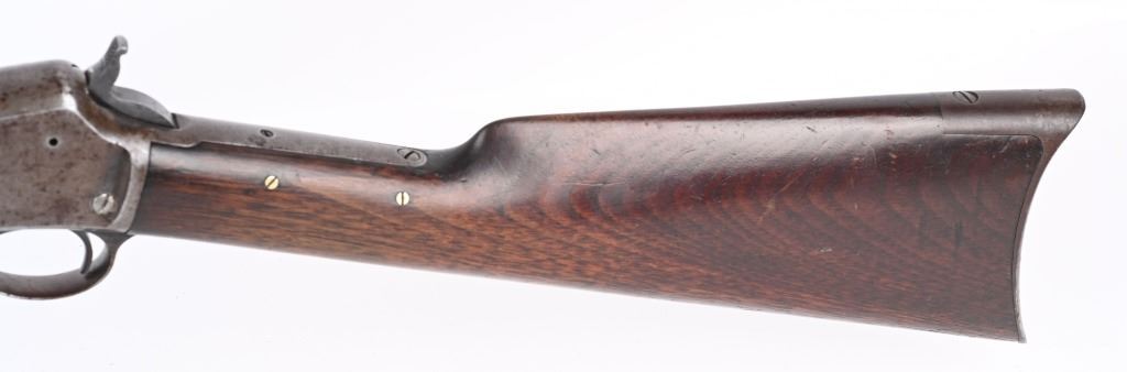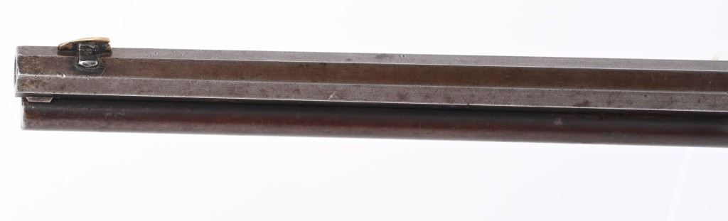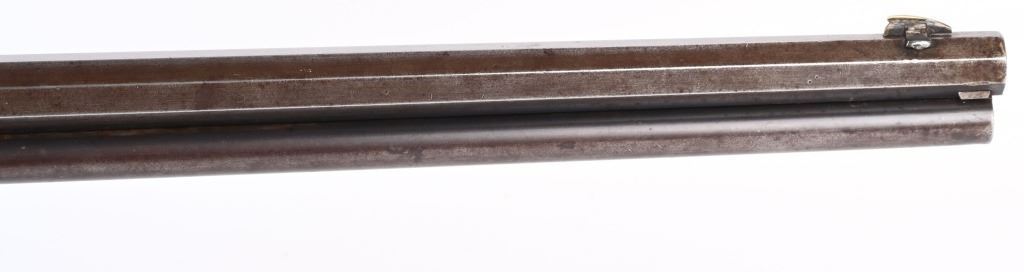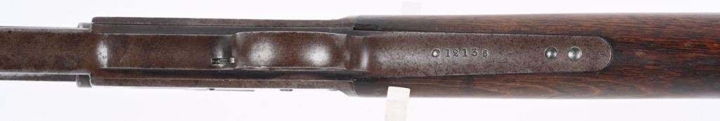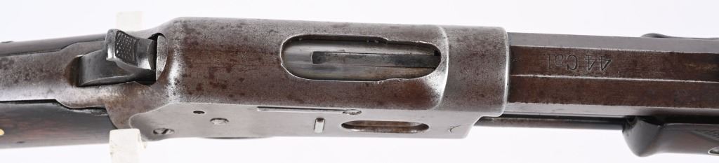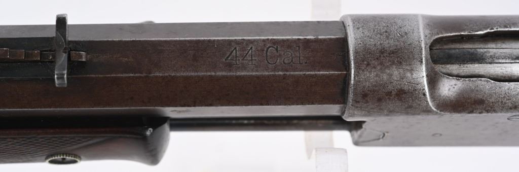 SERIAL 12136. BARREL 26". CALIBER 44-40. MADE IN 1885 2ND YEAR PRODUCTION. Standard features include full octagon barrel and magazine, open top with no dust cover, correct sporting sights, blue finish, walnut stock with rifle butt and two piece checkered forearm. Condition. The entire surface of metal is a smooth blue brown crisp patina with some light freckles. Bore is extremely clean and sharp. Forearm is excellent, no cracks, checkered has smoothed out a bit but very visible. Stock is excellent, proud to metal, with some minor dings and impressions. There are two small brass screws precisly placed on both sides of the wrist but they do not seem to be any type of repair as we can see no cracks or damages as if something, like a weird sight, had once been attached. Overall, a very clean and early 44. ANTIQUE