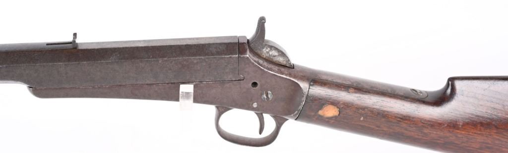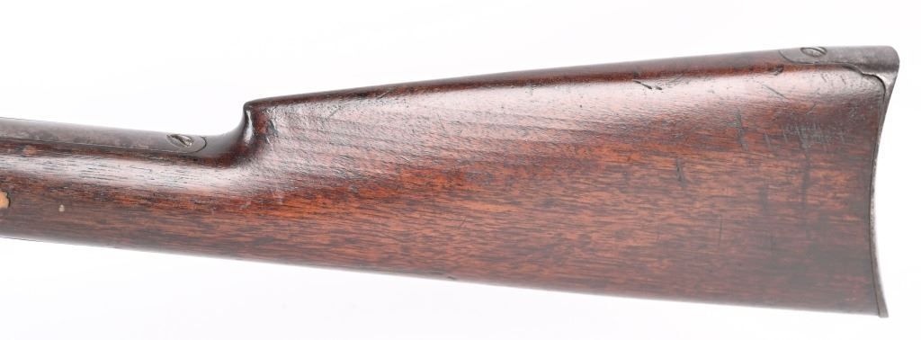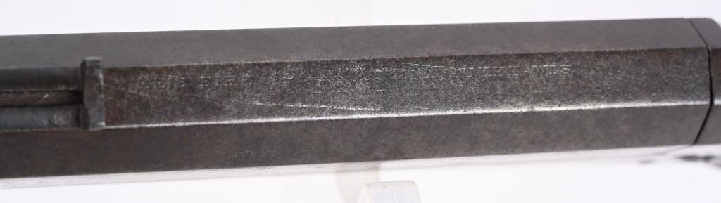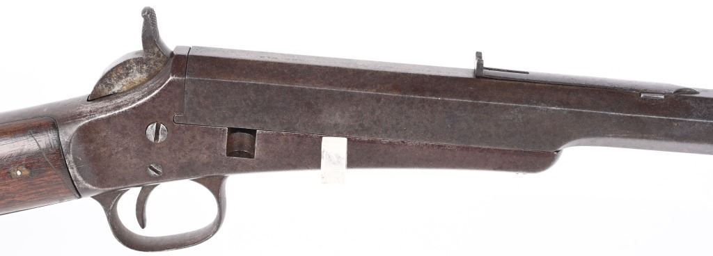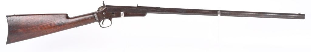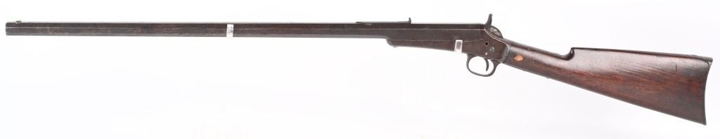 SERIAL 1348. BARREL 27". CALIBER 44RF. Lee’s Fire Arms Company Single Shot Sporting Rifle made circa 1865-66 in Milwaukee, Wisconsin. Made from 1865-66 as a sporting arm to continue doing business once the war had ended and the demand for their carbine that was privately purchased towards the end of the war fell out of favor. This rifle could not command enough sales to keep them in business after 1866. Features an octagon barrel that swings out to load. Exposed hammer, sporting sights, blue finish and walnut butt stock. Condition. Maker legend stamped on breech of barrel mostly readable. Metal has turned homogenous patina. Stock is very good but there is a putty wrist repair. Bore is strong but there is black powder abrasion. Very rare gun with low production. ANTIQUE