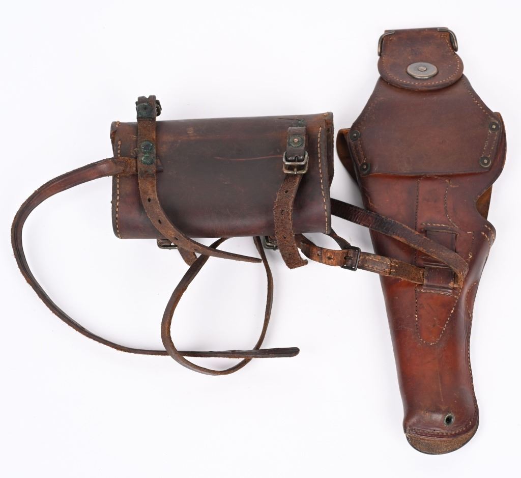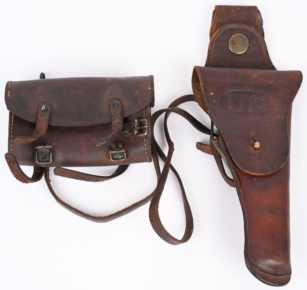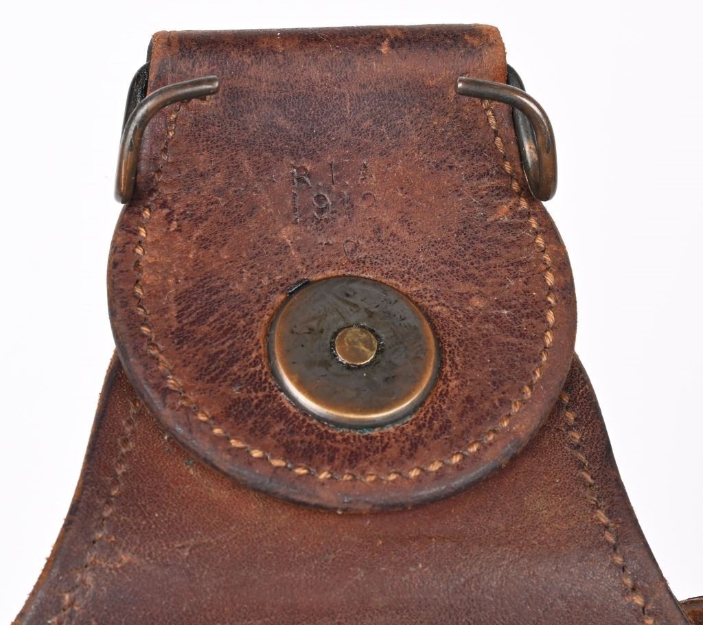 Made 1912 at Rock Island Arsenal (marked "R.I.A./1912" on the back). "US" marked on the front. Original leg strap is intact. Includes a leather tool pouch, possibly for a 1928 water cooled machine gun. CONDITION: Very good overall, with general wear and discoloration. Leg strap has a tear in it. Some crazing on the flap. Brass studs have some tarnish. Tool pouch has wear throughout. Verdigris on the buckles and studs.