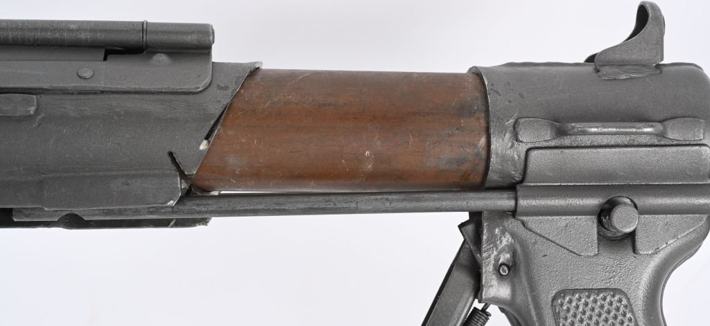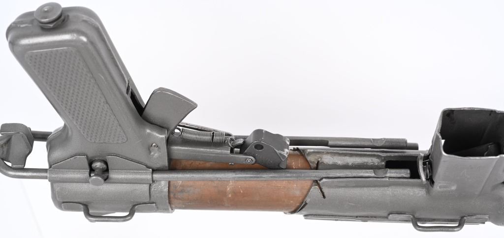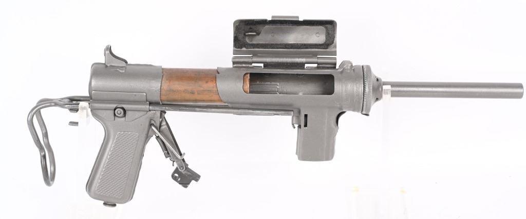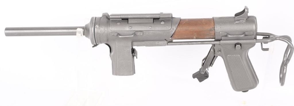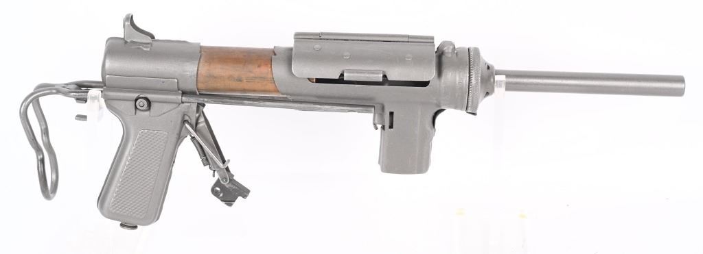 Saw cut M3A1 grease gun kit, marked "ITHACA GUN CO. INC" on the left side of the magazine well. Saginaw marked 8" in tact barrel. Other parts are mismatched makers. Gray phosphate finish. Includes one 30 round mag marked "SPW" on the front. An M7 rifle grenade launcher is also included. CONDITION: Metal is very good overall, with a few light handling marks. Bore is lightly frosted, with strong rifling. Magazine has light wear, as does the launcher.