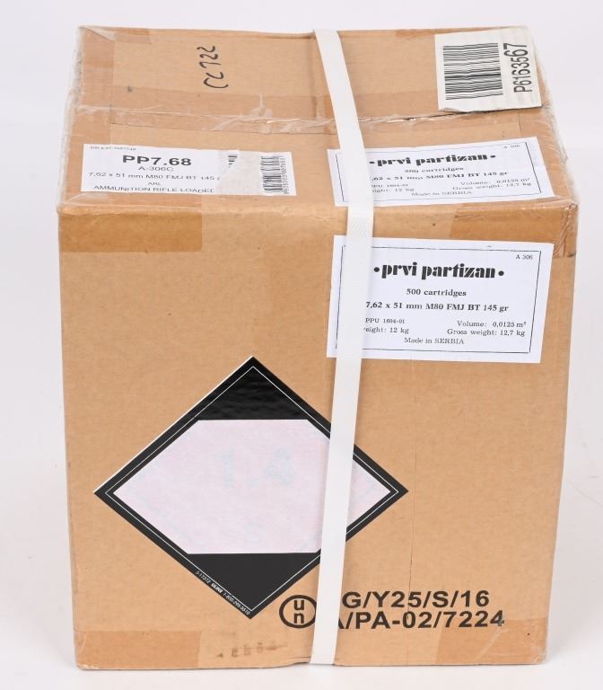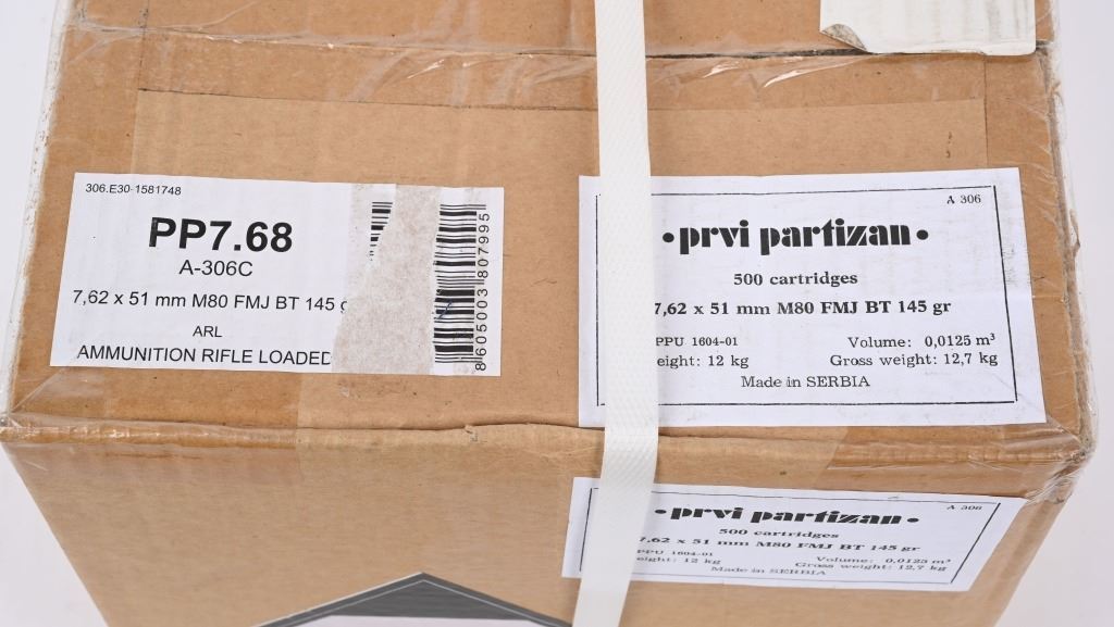 Sealed 500 round case of Serbian PPU 7.62X51 NATO M80 Ball. Brass cased, non corrosive. 145 GR FMJ boat tail bullet.