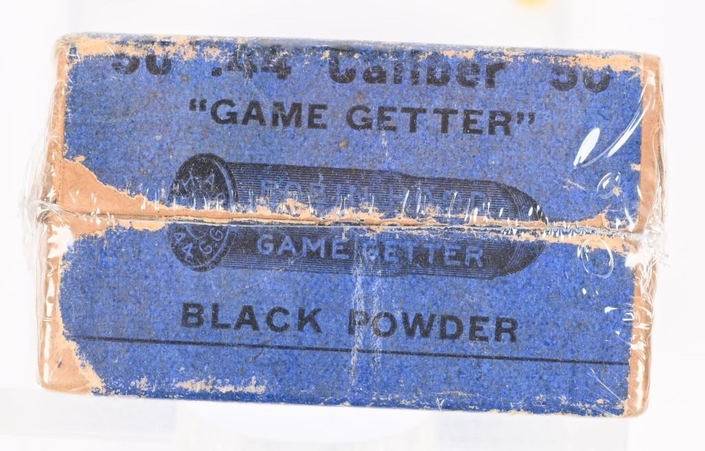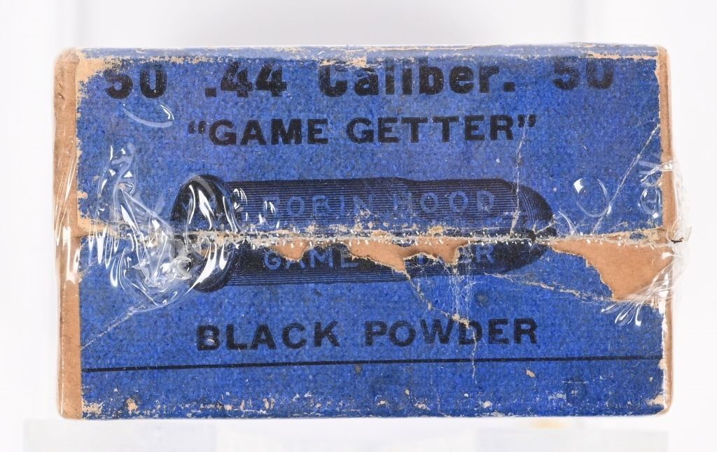 Tan 2-piece box with blue label. Wrapped and may have one round. The top label reads ".44 CAL. GAME GETTER / ROUND BALL CARTRIDGES / CENTER FIRE / ADAPTED TO MARBLE GAME GETTER AND OTHER RIFLES / MADE BY / ROBIN HOOD AMMUNITION COMPANY / SWANTON VT. U.S.A." The end label reads "50 .44 CALIBER 50 / GAME GETTER / BLACK POWDER" A full box of these sells for over 2000 and you would be hard pressed to find a nicer box CONDITION: Very fine with complete labels showing edge wear